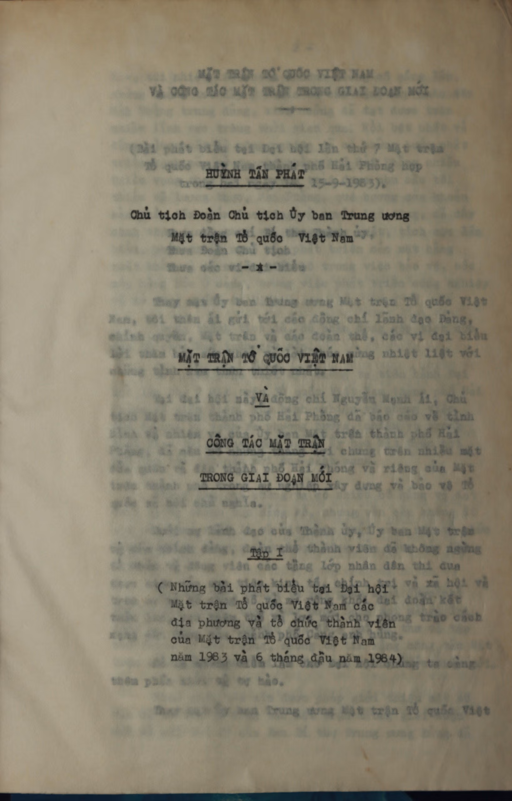 Nhóm hiện vật, tài liệu về kiến trúc sư Huỳnh Tấn Phát trong công tác Mặt trận, trong đó có tập tài liệu “Mặt trận Tổ quốc Việt Nam và công tác Mặt trận trong giai đoạn mới” gồm 13 bài phát biểu đầy tâm huyết của kiến trúc sư Huỳnh Tấn Phát; cuốn sổ công tác ghi chép cẩn thận, chi tiết nhiều vấn đề về công tác Mặt trận… Trên cương vị Chủ tịch Đoàn Chủ tịch Ủy ban Trung ương Mặt trận Tổ quốc Việt Nam, kiến trúc sư Huỳnh Tấn Phát đã có những đóng góp quan trọng trong việc đổi mới nội dung và phương thức hoạt động của Mặt trận, đưa công tác Mặt trận hướng về cơ sở, phát huy vai trò của Mặt trận trong việc xây dựng khối đại đoàn kết toàn dân tộc, thực hiện các nhiệm vụ kinh tế, xã hội, văn hóa, đối ngoại, an ninh, quốc phòng. Ông đã tích cực đưa Chỉ thị 17 của Ban Bí thư Trung ương Đảng về tăng cường sự lãnh đạo của Đảng đối với công tác Mặt trận vào cuộc sống, góp phần nâng cao vị thế và vai trò của Mặt trận trong giai đoạn mới. Bài phát biểu tại Đại hội III Ủy ban Bảo vệ cách mạng Cuba năm 1986, cuốn hộ chiếu ngoại giao sử dụng sang Liên Xô năm 1988, Chứng nhận Huân chương Liên Xô của kiến trúc sư Huỳnh Tấn Phát…đã phần nào minh chứng những đóng góp của ông với đoàn kết dân tộc và đoàn kết quốc tế.