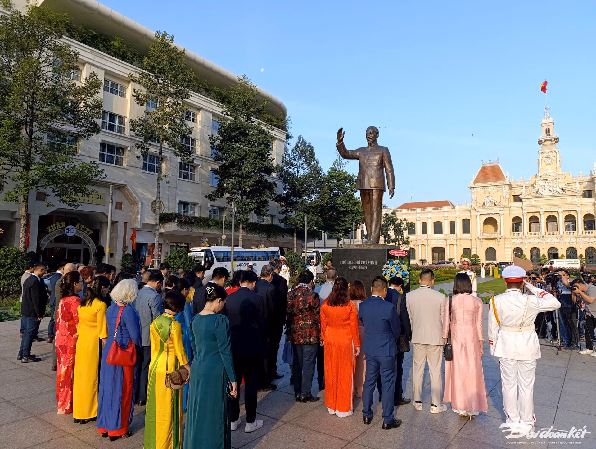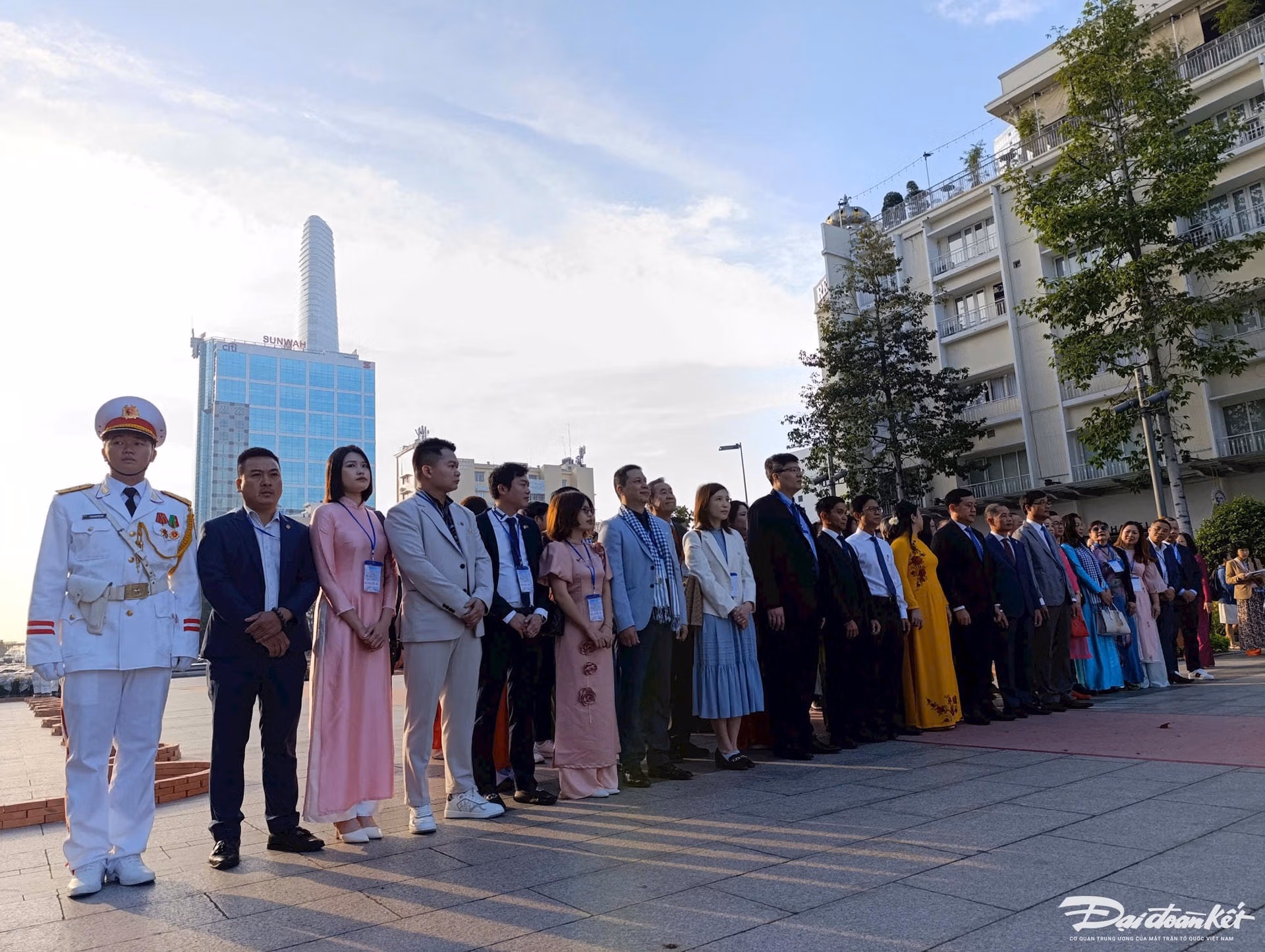 Tham dự Lễ dâng hoa có ông Hà Phước Thắng - Thành ủy viên, Phó Trưởng đoàn Đoàn Đại biểu Quốc hội TPHCM, bà Vũ Thị Huỳnh Mai - Chủ nhiệm Ủy ban về người Việt Nam ở nước ngoài TPHCM cùng hơn 50 kiều bào đến từ nhiều quốc gia.