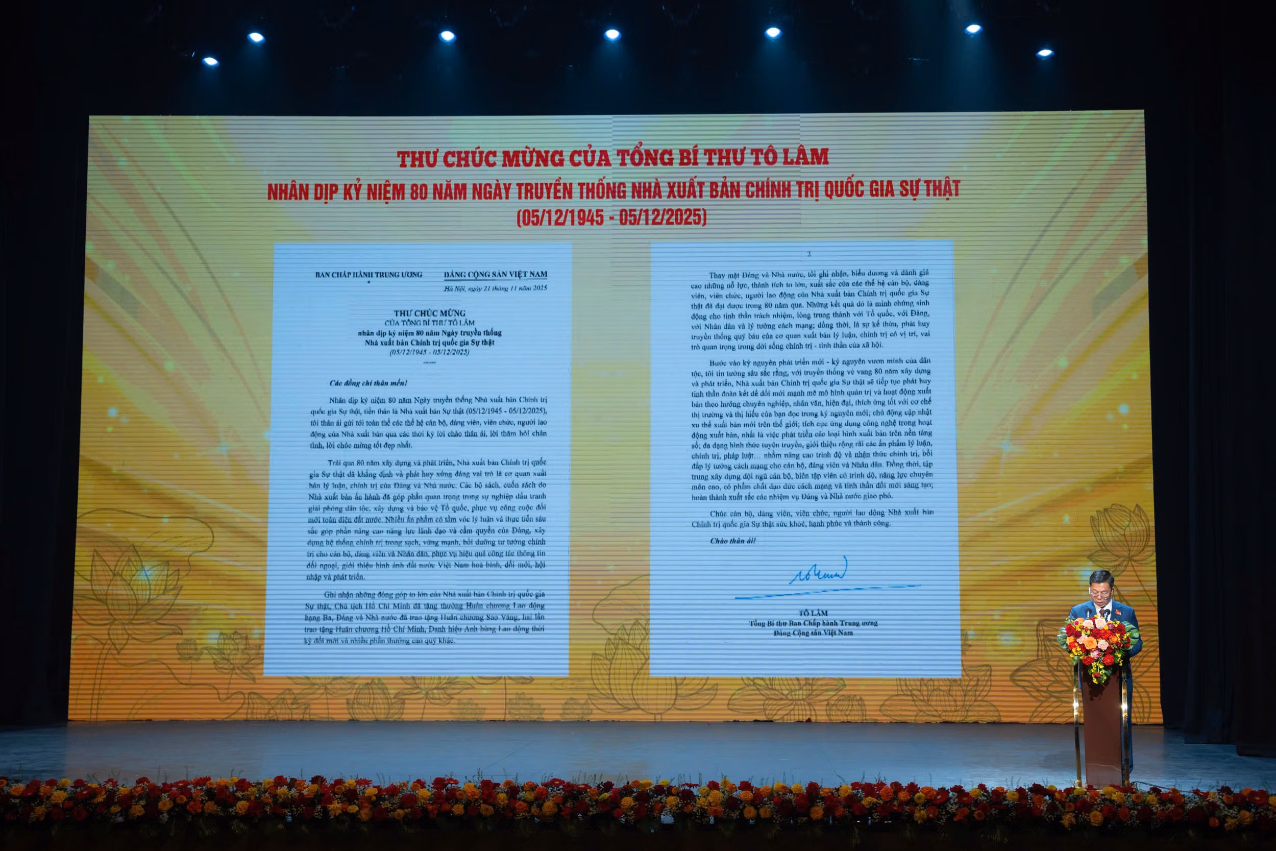 Tại Lễ kỷ niệm, PGS.TS. Vũ Trọng Lâm, Bí thư Đảng ủy, Giám đốc - Tổng Biên tập Nhà xuất bản Chính trị quốc gia Sự thật đã công bố Thư chúc mừng của Tổng Bí thư Tô Lâm.