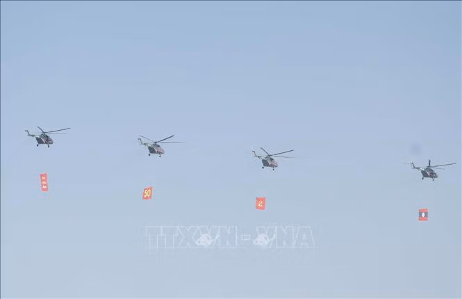 Ngay sau diễn văn của Tổng Bí thư, Chủ tịch nước Lào Thongloun Sisoulith, lễ diễu binh, diễu hành của các lực lượng vũ trang; các bộ, ban, ngành; các tổ chức, đoàn thể chính trị - xã hội diễn ra hoành tráng, trang nghiêm, thể hiện sinh động những thành tựu trên mọi lĩnh vực đời sống, xã hội, kinh tế và quốc phòng mà Đảng và nhân dân Lào đã giành được trong suốt 50 năm qua.