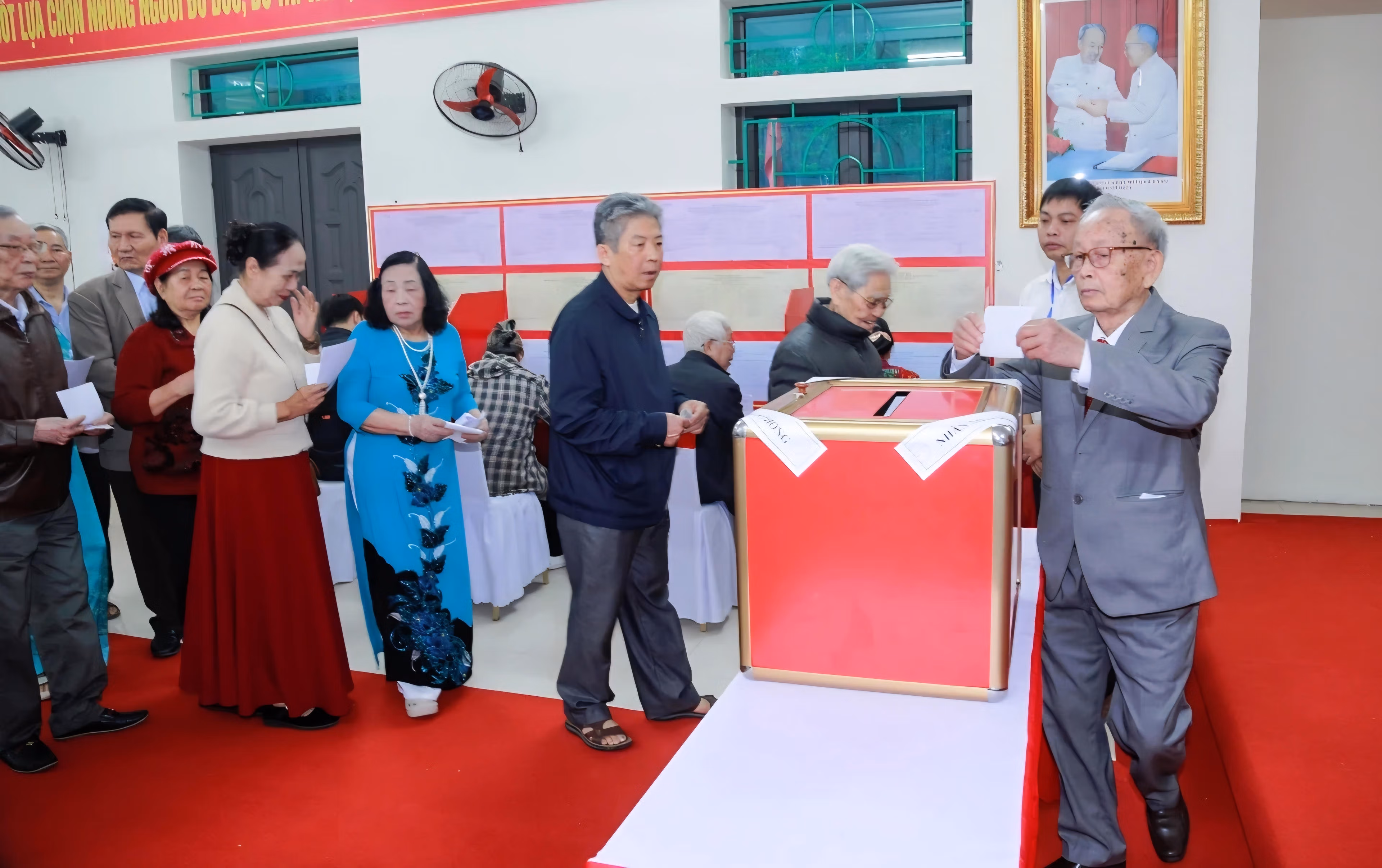 Đúng 7 giờ sáng, lễ khai mạc bầu cử được tổ chức trang trọng tại nhà văn hóa Tổ dân phố Đội Cung 3. Trong không khí nghiêm trang, các đại biểu và cử tri thực hiện nghi thức chào cờ, thể hiện tinh thần trách nhiệm và niềm tự hào khi tham gia sự kiện chính trị quan trọng của đất nước. Tổ trưởng Tổ bầu cử phổ biến nội quy, quy chế bỏ phiếu để cử tri nắm rõ và thực hiện đúng quy định.