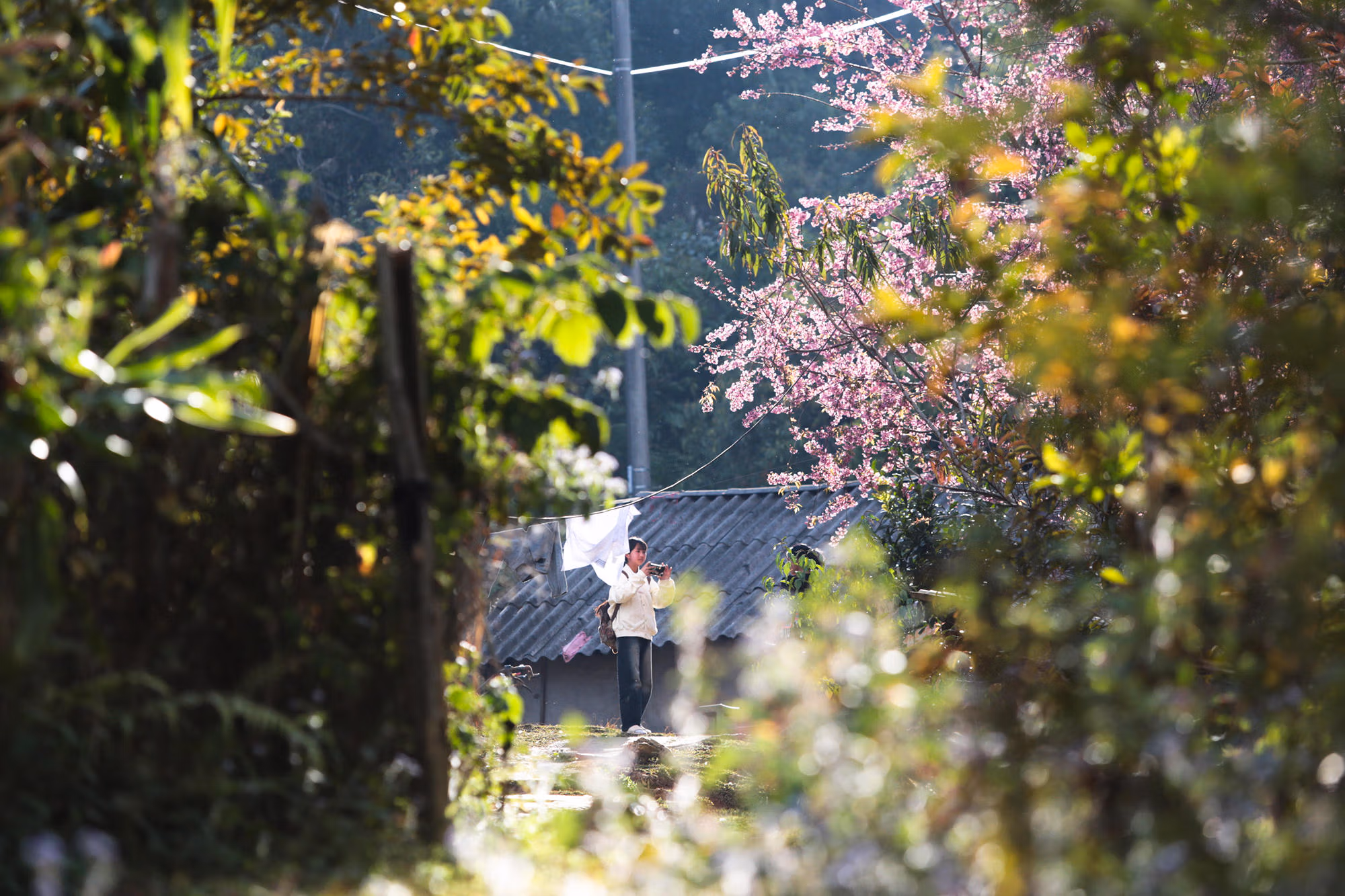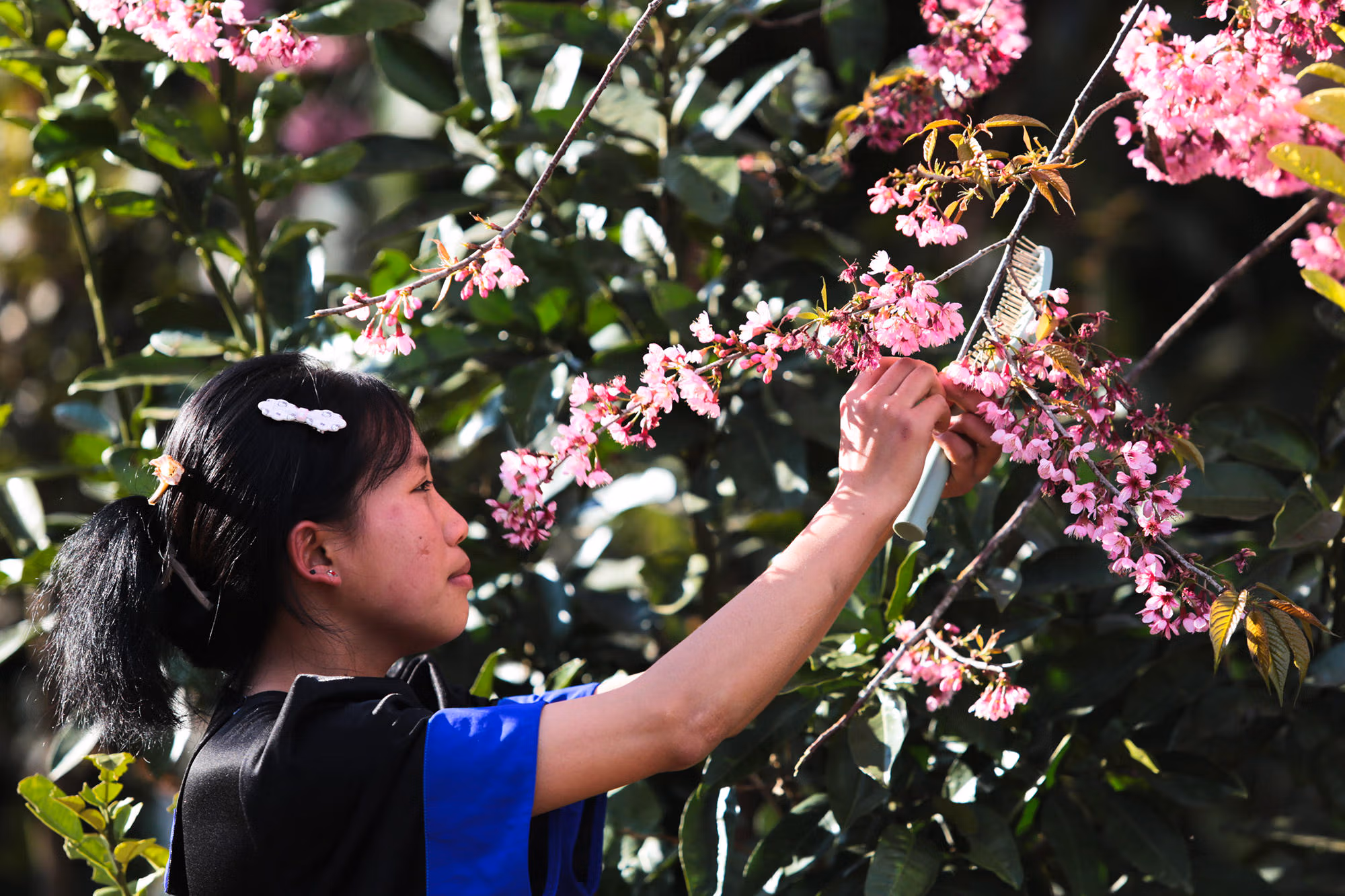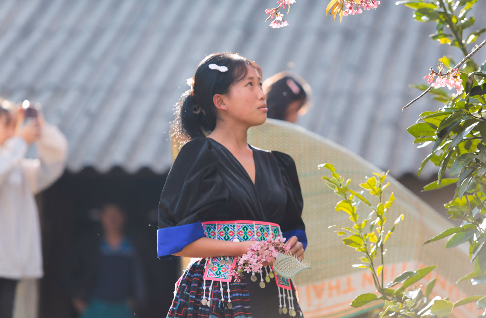 Dịp cuối tuần, tranh thủ thời gian nghỉ học, những thiếu nữ người Mông xúng xính trong trang phục truyền thống, chụp lưu giữ khoảnh khắc đẹp bên hoa đào.