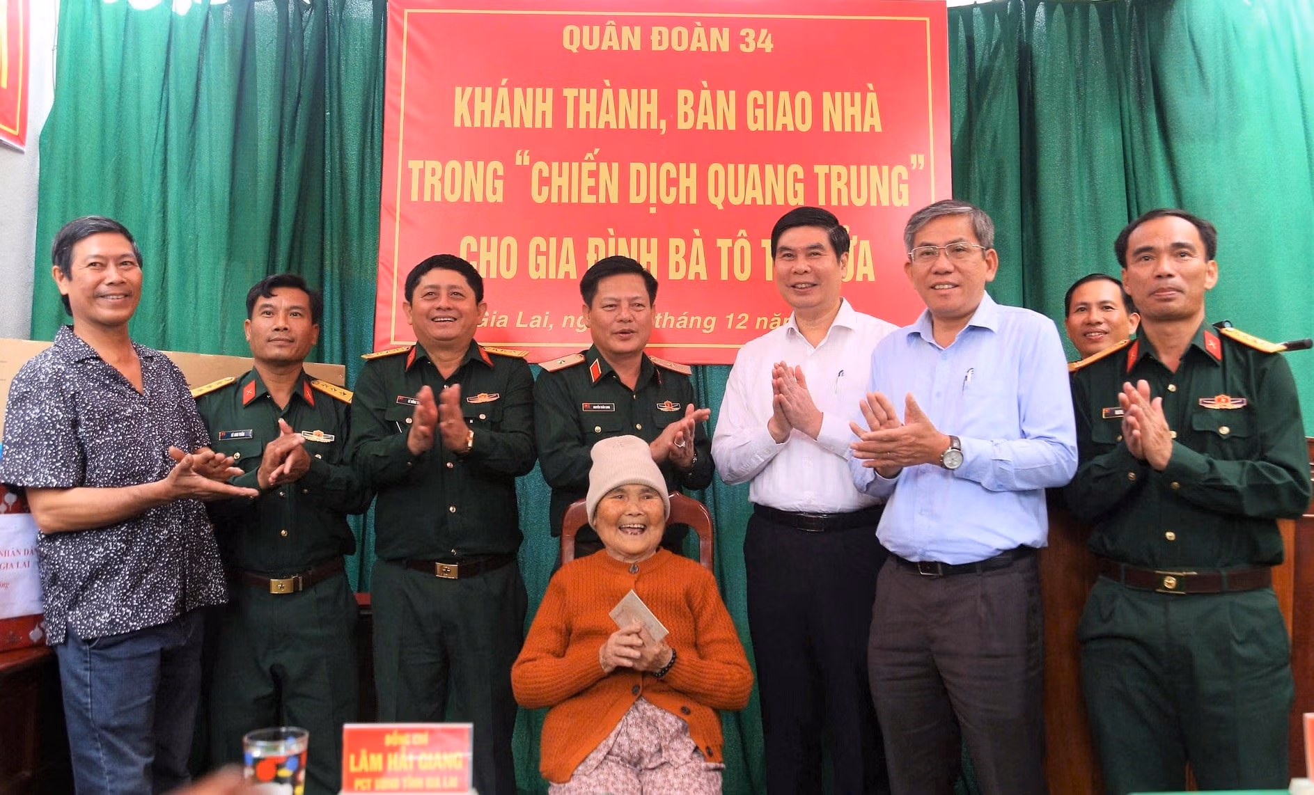 Còn bà Tô Thị Sửa (88 tuổi), ở xã Ngô Mây, tỉnh Gia Lai, đang ở trong căn nhà mới còn mùi vôi vữa, do Lữ đoàn Công binh 7 (Quân đoàn 34) trực tiếp hỗ trợ thi công. Sau hơn 15 ngày đêm khẩn trương xây dựng, căn nhà của bà đã hoàn thành. Bà Sửa nói: “Khi gia đình tôi rơi vào cảnh khốn khó nhất, bộ đội cùng chính quyền địa phương đã đến giúp đỡ tận tình, không quản nắng mưa. Nhờ vậy, tôi mới có mái ấm để yên tâm sinh sống. Cuối đời đón nhận niềm vui này tôi vô cùng mãn nguyện”.
