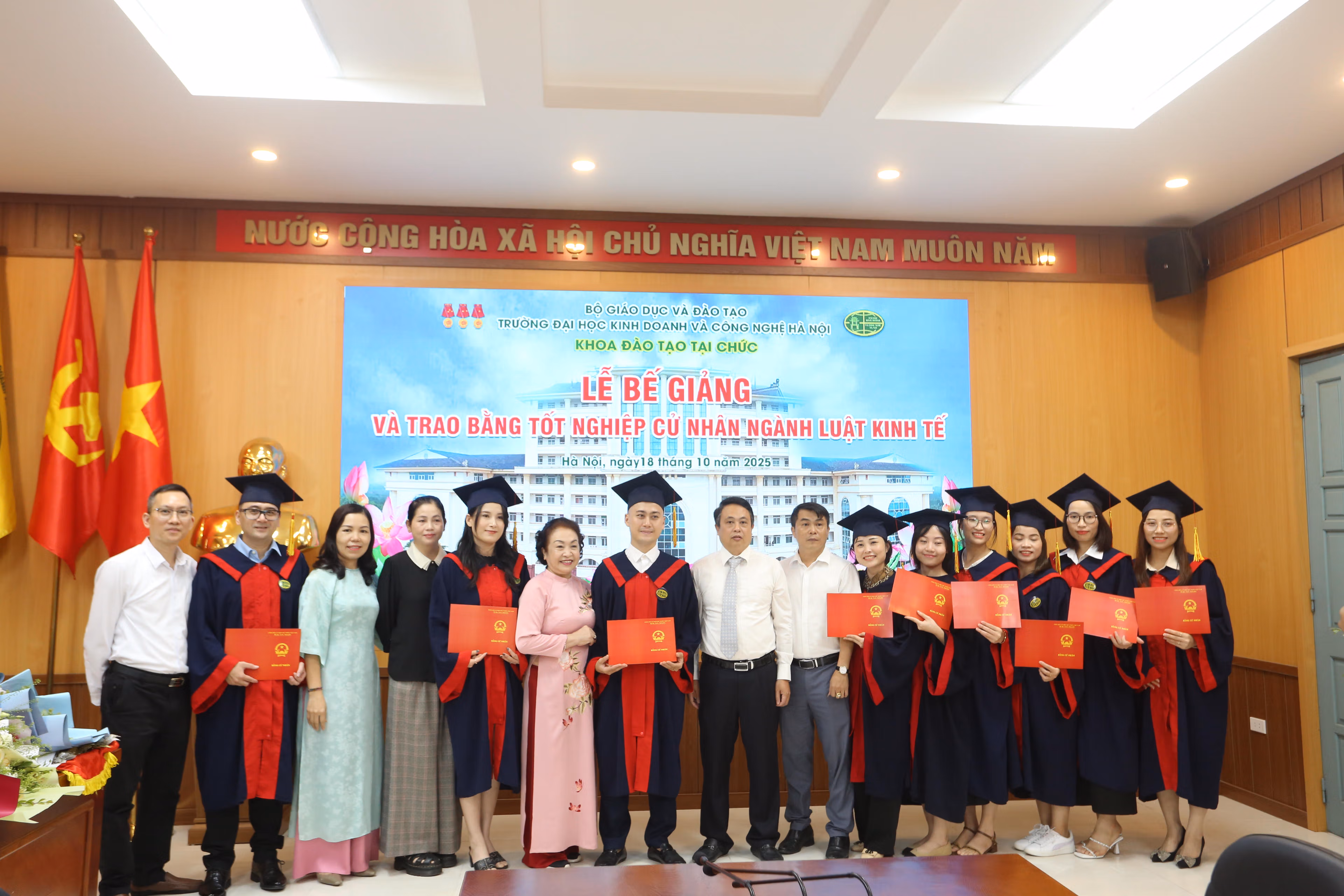 Tại Lễ trao bằng tốt nghiệp đại học hình thức vừa làm vừa học cho sinh viên ngành Luật Kinh tế của Trường Đại học Kinh doanh và Công nghệ Hà Nội (tối 18/10), TS Nguyễn Đại Lâm – Phó Chủ nhiệm Thường trực Khoa Đào tạo tại chức – nhấn mạnh, việc hoàn thành chương trình học không chỉ là cột mốc ghi nhận nỗ lực của người học, mà còn khẳng định giá trị của tinh thần học tập suốt đời trong xã hội hiện đại.