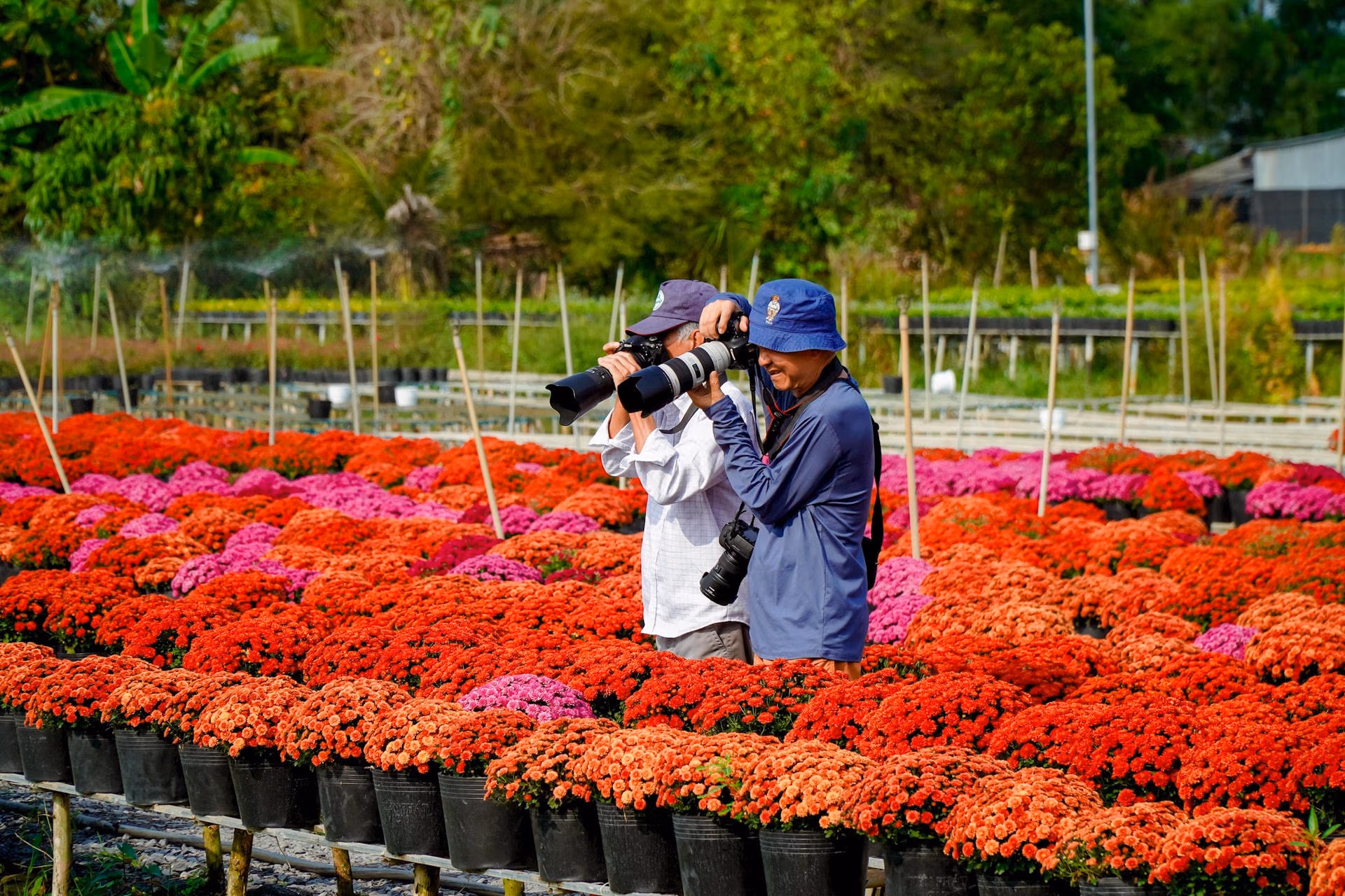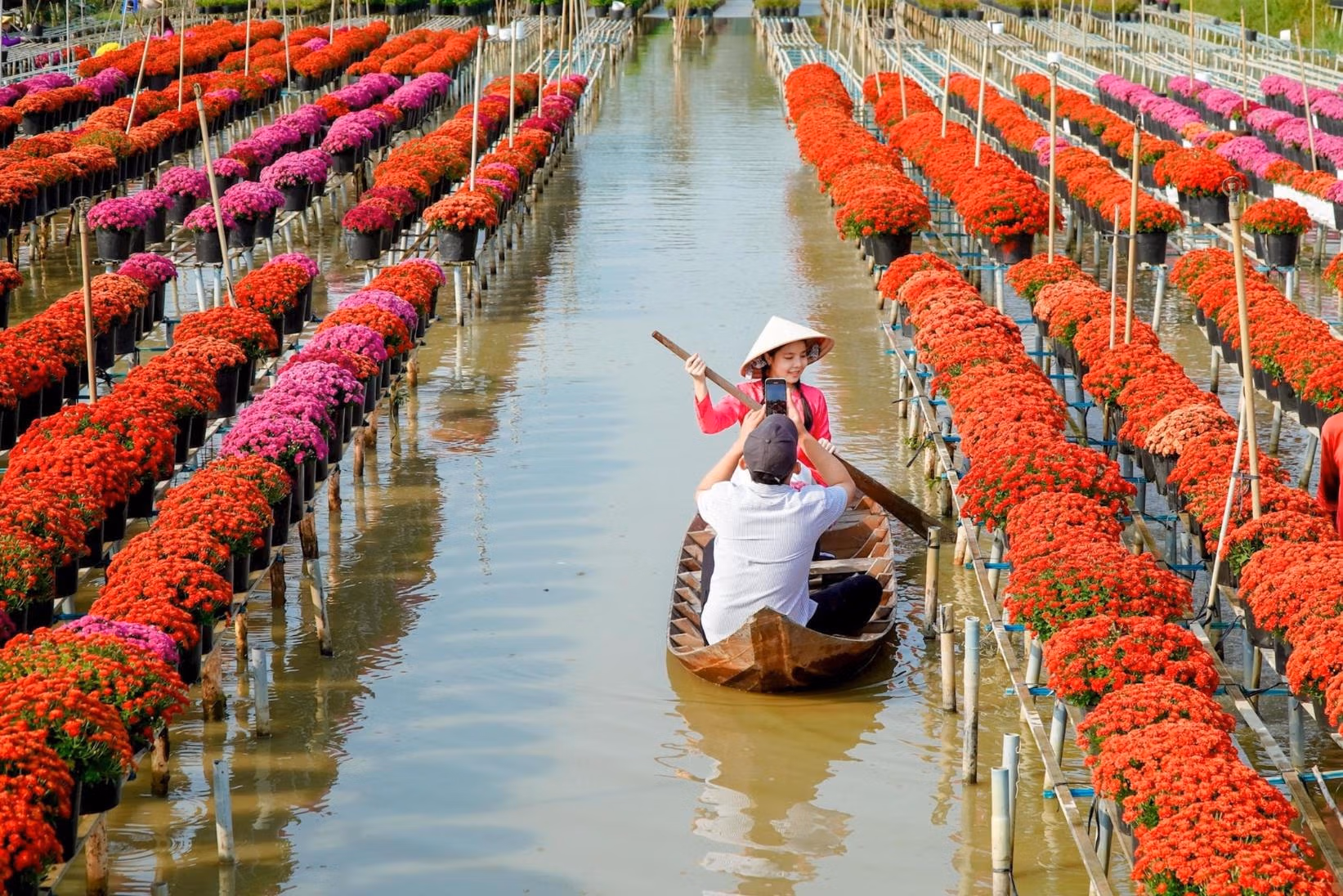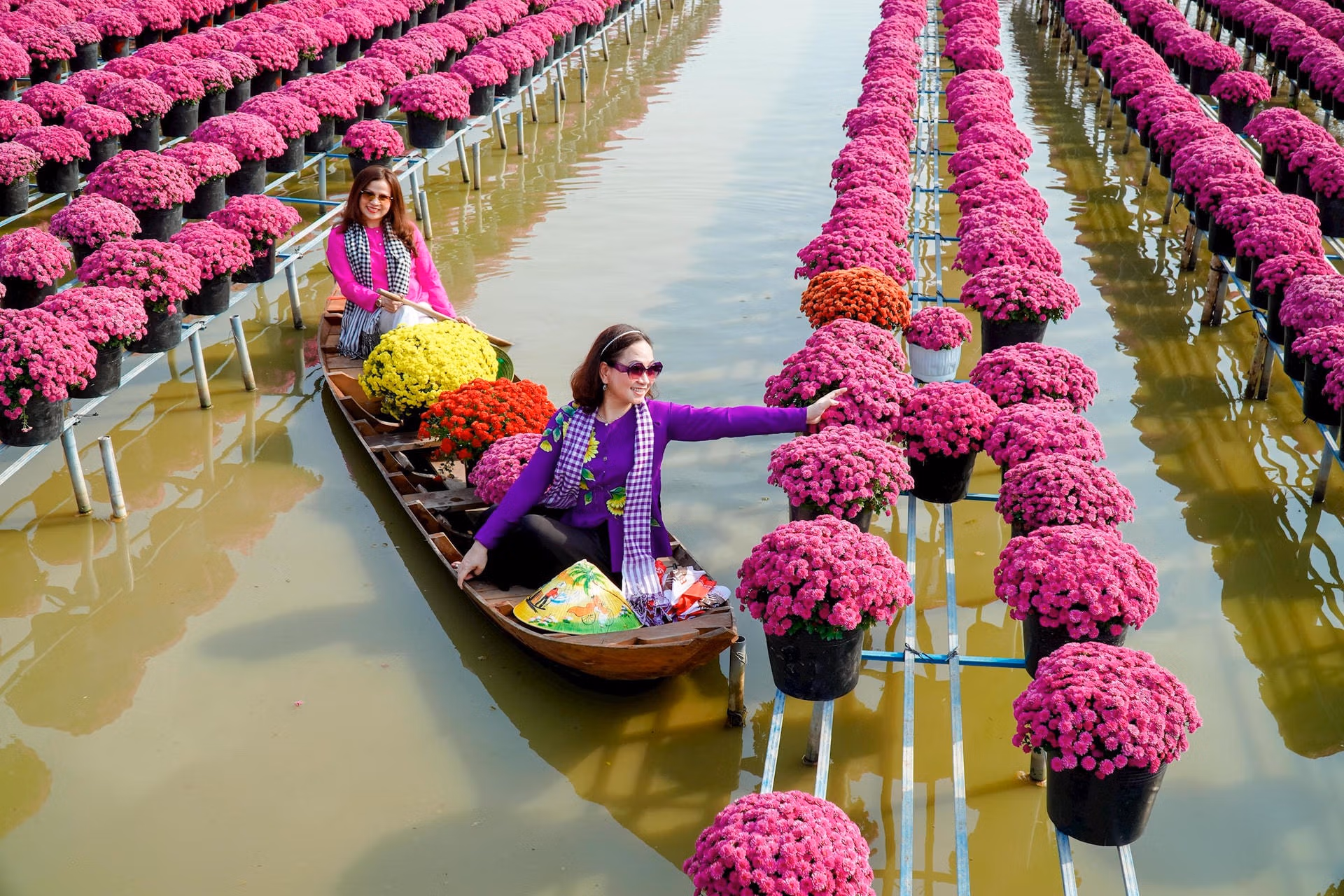 Làng hoa Sa Đéc lôi cuốn du khách bằng sắc màu rực rỡ Chủ Nhật 26/01/2025 08:00 (GMT+7) Những ngày này, làng hoa Sa Đéc (Đồng Tháp) rực rỡ sắc màu với trăm hoa đua nở thu hút nhiều du khách khắp nơi tìm về. Làng hoa Sa Đéc rực rỡ sắc màu lôi cuốn du kháchLàng hoa Sa Đéc (Đồng Tháp) rộng gần 1.000 ha, có tuổi đời trăm năm với hơn 4.000 hộ sản xuất, kinh doanh hoa kiểng các loại.Điểm đặc biệt của làng hoa Sa Đéc là các hộ trồng hoa trên mặt nước. Để chăm sóc hoa, chủ vườn có thể lội nước hoặc chèo xuồng.Mùa Tết Ất Tỵ 2025, các loài hoa truyền thống như: Cúc mâm xôi, vạn thọ, cát tường... được nhiều nhà vườn chọn trồng.Nông dân làng hoa chăm sóc hoa kiểng những ngày cuối năm.Các loài hoa thi nhau khoe sắc nhờ bàn tay cần mẫn của người dân làng hoa.Đa số các vườn hoa cho du khách tham quan miễn phí hoặc thu vé từ 10.000 - 50.000 đồng một người.Thời tiết cuối năm ở Sa Đéc khá mát mẻ, nhiều du khách mang theo khăn rằn vừa để tạo dáng lúc chụp hình vừa để che nắng.Một số nhà vườn tạo các tiểu cảnh mang nét Tết xưa để du khách chụp ảnh.Vừa chụp ảnh check-in cùng bạn, chị Nguyễn Thị Ngọc Bích (khăn rằn đen), du khách đến từ TP Cần Thơ cho biết: Dịp Tết này các nhà vườn tại Làng hoa Sa Đéc thật rực rỡ. Đây là dịp để giới thiệu quảng bá hình ảnh đẹp đến bạn bè và người thân tìm đến thưởng ngoạn tại nơi này.Nhiều người tranh thủ săn những bức ảnh đẹp vào mùa xuân.Khách du lịch cũng là nguồn khách lớn để nhà vườn bán hoa tận tay người tiêu dùng. Thanh Tiến - Thành Thật