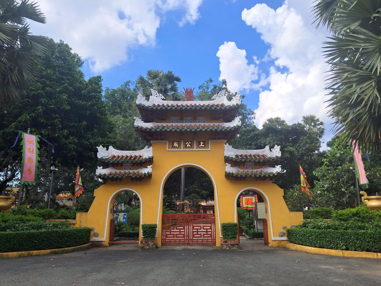 Tôi có thói quen ghé thăm lăng vào những chiều nắng nhẹ, khi cái nóng thành thị đã bớt đi phần gay gắt. Chậm rãi men theo con đường lốm đốm nắng vàng, vòng qua hàng thốt nốt vi vút gió reo, tôi đến trước cổng Tam Quan sừng sững phía Nam, nơi có tấm bảng chữ nổi khắc ba chữ “Thượng Công Miếu” đã rêu phong theo thời gian. Trên nóc nhà bia đã xỉn màu đặt một bộ “Lưỡng long tranh châu” trứ danh. Linh hồn của bức đồ án là trái châu sứ xanh biêng biếc thuộc dòng gốm sứ Cây Mai gần trăm năm tuổi. Bất chấp bao phen bị đánh cắp, quả châu vẫn kỳ diệu trở về đúng chỗ cũ, da xanh nước ngọc vẹn nguyên. Sắc xanh biêng biếc ấy tương phản với mái ngói đỏ tía chồng lên nhau thành từng tầng, gợi nên hình ảnh của những chiếc thuyền rồng chênh vênh trùng điệp.