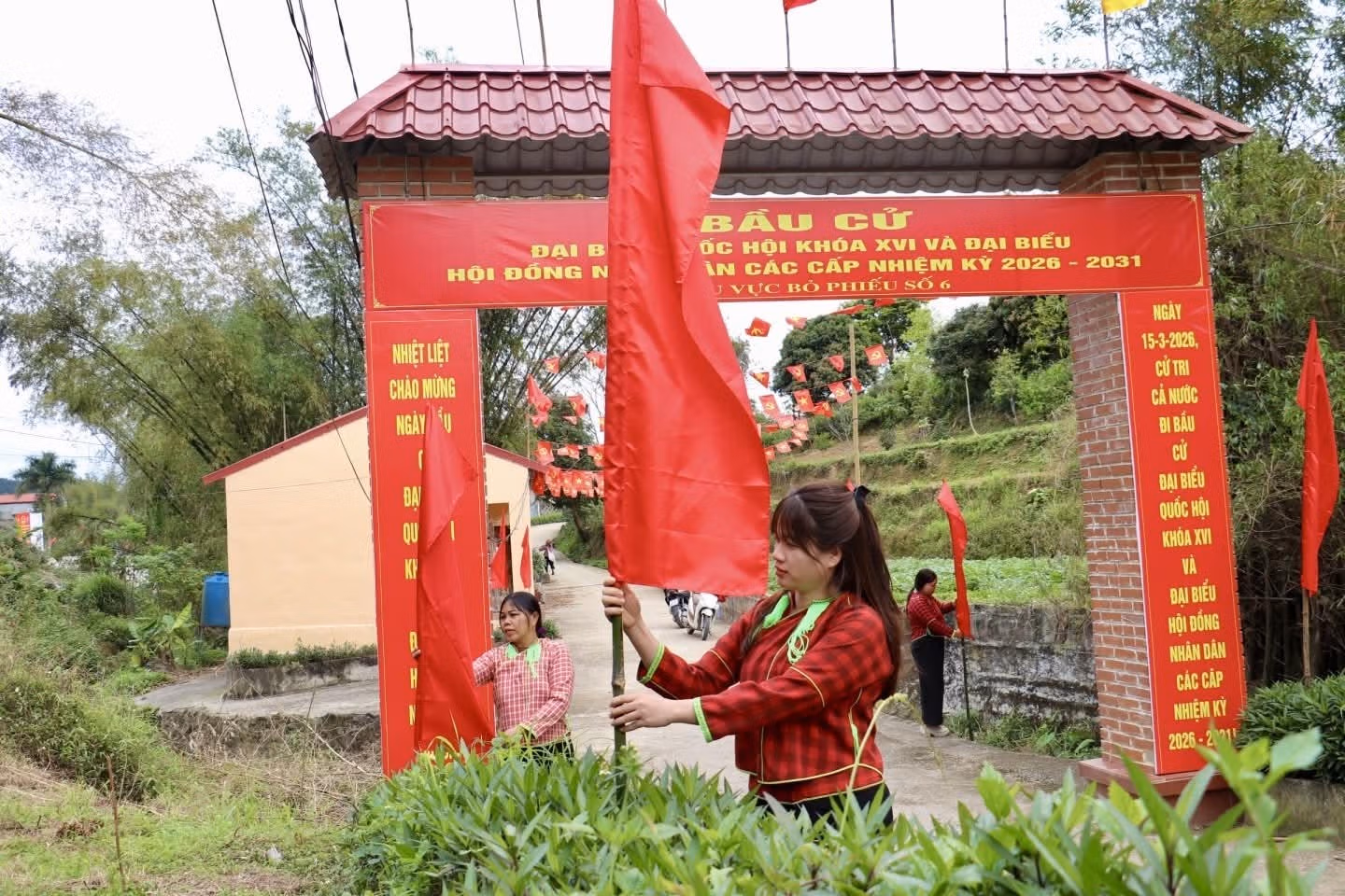 Từ trung tâm xã đến các thôn bản xa xôi, không khí chuẩn bị cho ngày bầu cử đang lan tỏa rộng khắp. Những con đường vào bản rực rỡ cờ đỏ, những tấm pano tuyên truyền được treo ngay ngắn trước nhà văn hóa thôn, tất cả như báo hiệu ngày hội lớn đang đến rất gần.