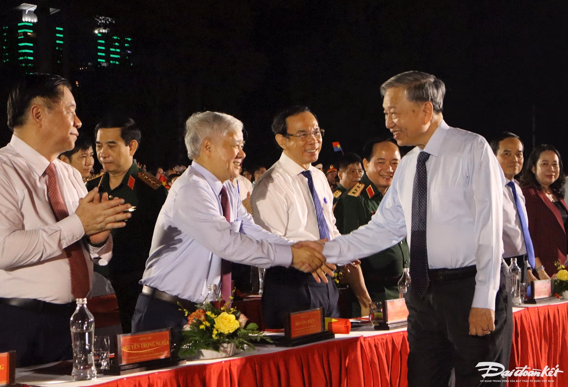 Đến dự chương trình có Ủy viên Bộ Chính trị, Tổng Bí thư Tô Lâm; các Ủy viên Bộ Chính trị: ông Đỗ Văn Chiến - Chủ tịch Ủy ban Trung ương Mặt trận Tổ quốc Việt Nam; ông Nguyễn Hòa Bình - Phó Thủ tướng Thường trực Chính phủ; ông Nguyễn Trọng Nghĩa - Trưởng Ban Tuyên giáo và Dân vận Trung ương; ông Phan Đình Trạc - Trưởng Ban Nội chính Trung ương; Đại tướng Phan Văn Giang - Bộ trưởng Bộ Quốc phòng; Đại tướng Lương Tam Quang - Bộ trưởng Bộ Công an; ông Nguyễn Văn Nên - Bí thư Thành ủy TP Hồ Chí Minh.