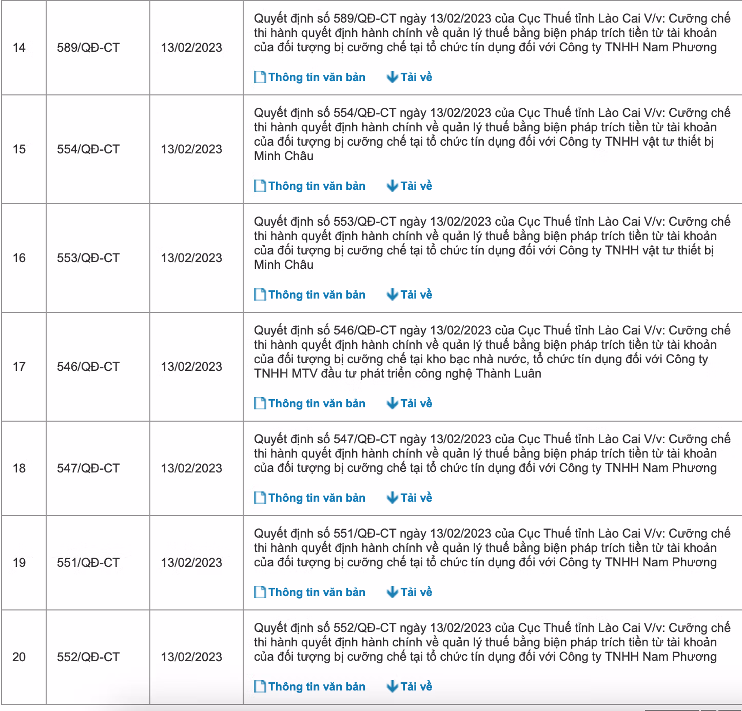 Theo thông tin từ Cục thuế Lào Cai, đây là những doanh nghiệp mà Cục thuế tỉnh Lào Cai nhiều lần ra quyết định hành chính cưỡng chế thi hành về quản lý thuế bằng biện pháp trích tiền từ tài khoản của đối tượng bị cưỡng chế tại tổ chức tín dụng.