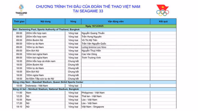Lịch thi đấu SEA Games 33 ngày 10/12: Việt Nam chờ "mưa" HCV ngày ra quân