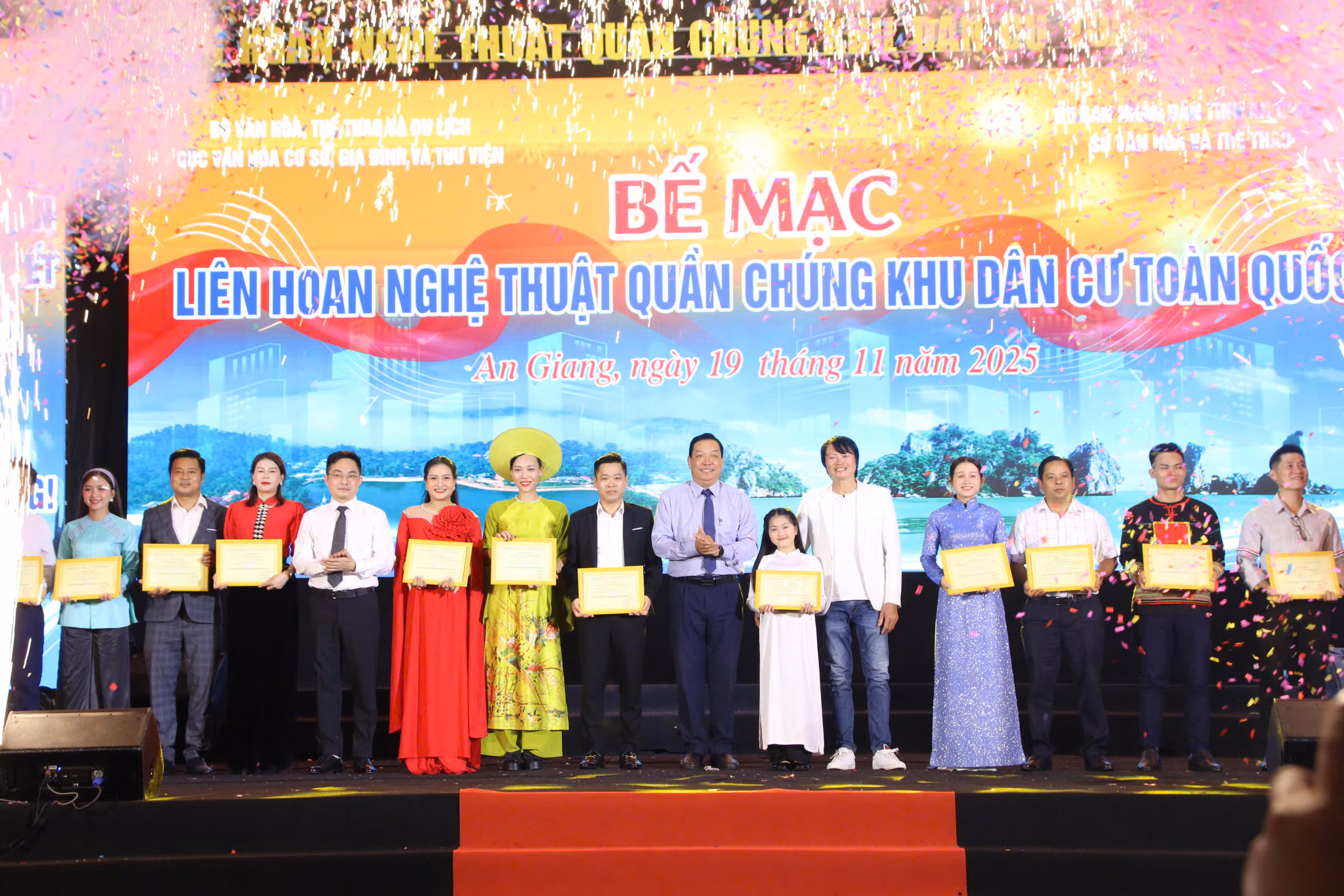 Sau 5 ngày tranh tài sôi nổi, tối 19/11, Liên hoan Nghệ thuật Quần chúng Khu dân cư toàn quốc 2025 do Bộ Văn hóa, Thể thao và Du lịch phối hợp với UBND tỉnh An Giang tổ chức đã bế mạc. Phát biểu tại buổi lễ, ông Nguyễn Quốc Huy - Phó Cục trưởng Cục Văn hóa cơ sở, Gia đình và Thư viện cho biết, những ngày qua, cả nước hân hoan tổ chức Ngày hội Đại đoàn kết toàn dân tộc, chào mừng kỷ niệm 95 năm Ngày truyền thống Mặt trận Tổ quốc Việt Nam (18/11/1930 - 18/11/2025).