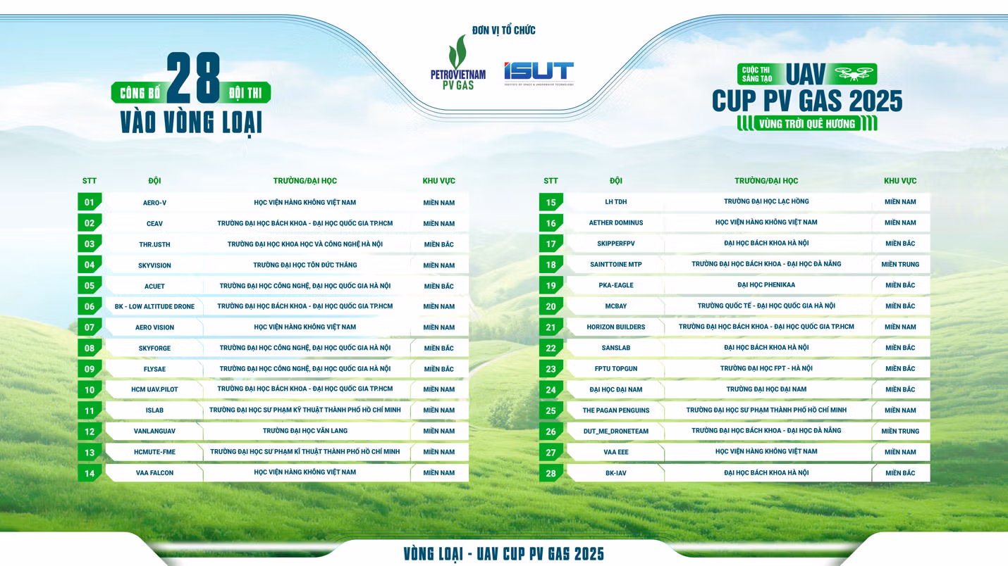 Trải qua quá trình đánh giá nghiêm túc và chuyên môn của Hội đồng ban giám khảo, 28 đội thi đã thể hiện được năng lực thiết kế - chế tạo, sự sáng tạo trong ứng dụng UAV, cùng tinh thần nghiên cứu khoa học và kỹ năng làm việc nhóm nổi bật. Danh sách này không chỉ phản ánh chất lượng chuyên môn mà còn thể hiện sự lan tỏa sâu rộng của cuộc thi tới cộng đồng sinh viên ngành kỹ thuật - công nghệ trên toàn quốc.