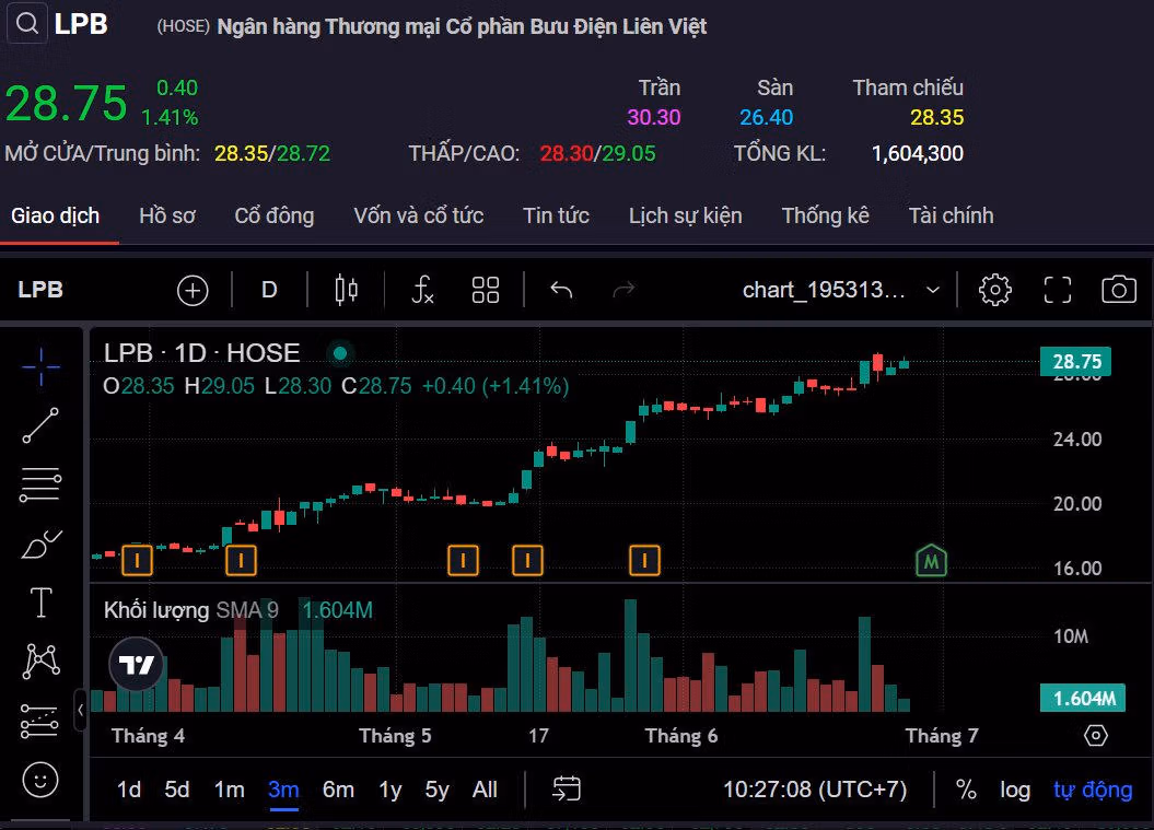 Trên sàn chứng khoán, trong khoảng 3 tháng trở lại đây, cổ phiếu LPB có nhiều diễn biến tích cực. Ngày 21/6 vừa qua, LPB thiết lập đỉnh giá mới với biên độ tăng 6,47%, đóng cửa ở mức 28.800 đồng/cổ phiếu, thanh khoản đạt hơn 12,5 triệu đơn vị. Với mức giá này, vốn hoá LPBank đã vượt ngưỡng 73.600 tỷ đồng.
