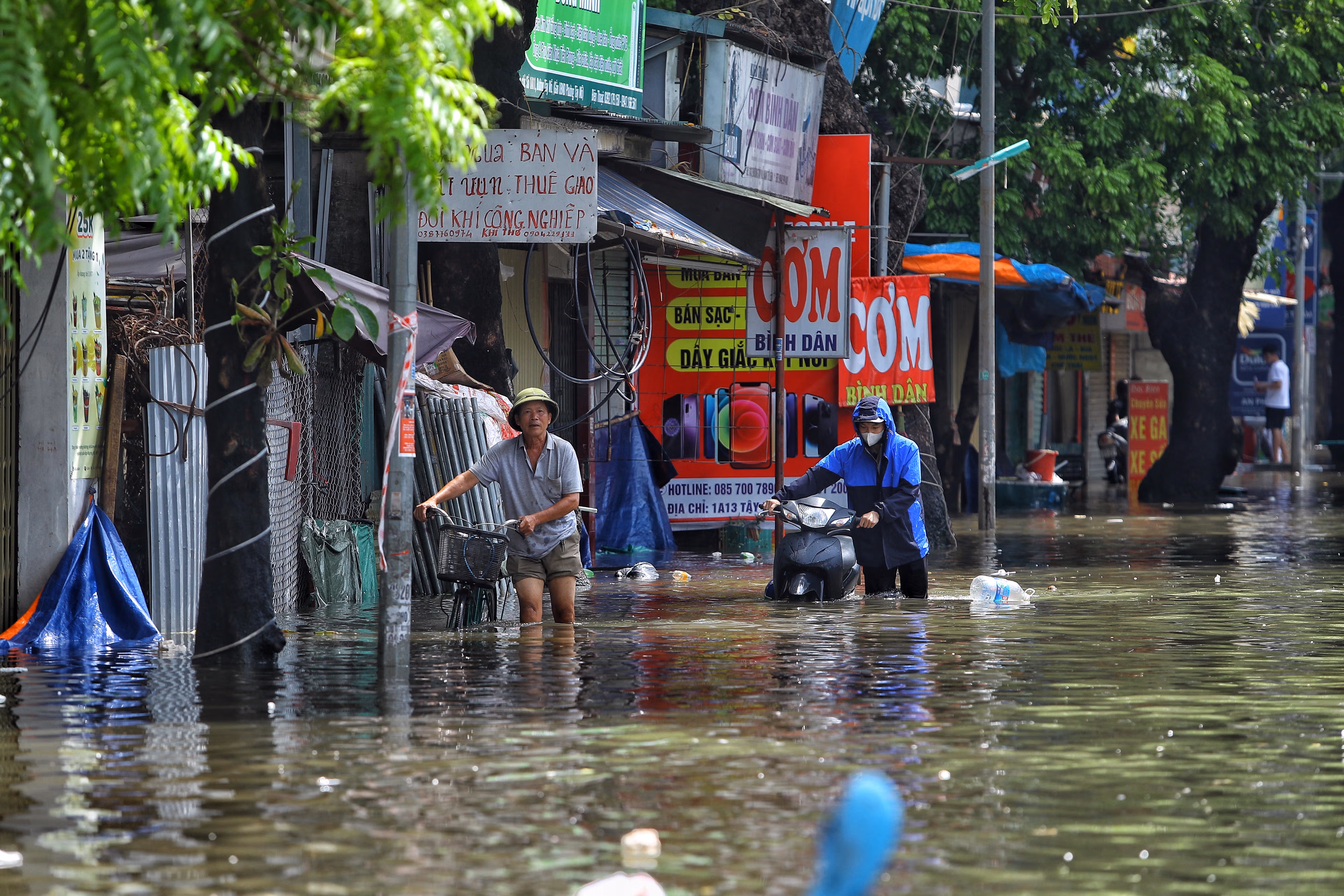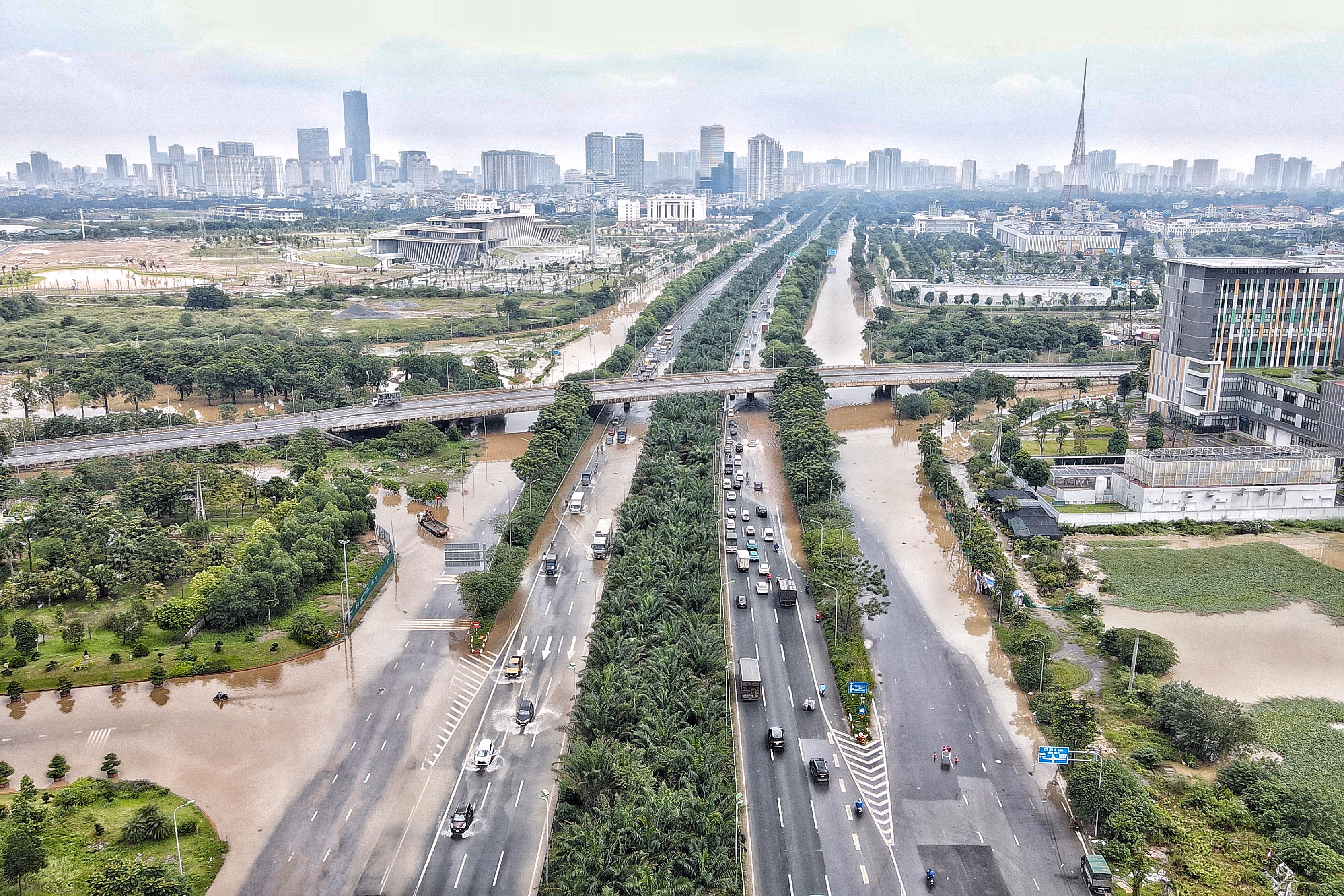 Do ảnh hưởng của hoàn lưu bão số 11, Hà Nội dù đã ngớt mưa, nhưng khu vực đường gom Đại lộ Thăng Long vẫn mênh mông biển nước. Tại khu vực cầu Ngà lực lượng Dân quân tự vệ dùng phà tự chế đưa người dân qua khu vực ngập.