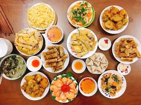 Mâm cỗ này thường được chuẩn bị tươm tất, gồm những món ăn ngon vẫn được dùng cho các ngày giỗ chạp, lễ Tết như gà luộc, xôi trắng, nem rán, giò chả, món xào, món nộm, xôi, cơm, canh...