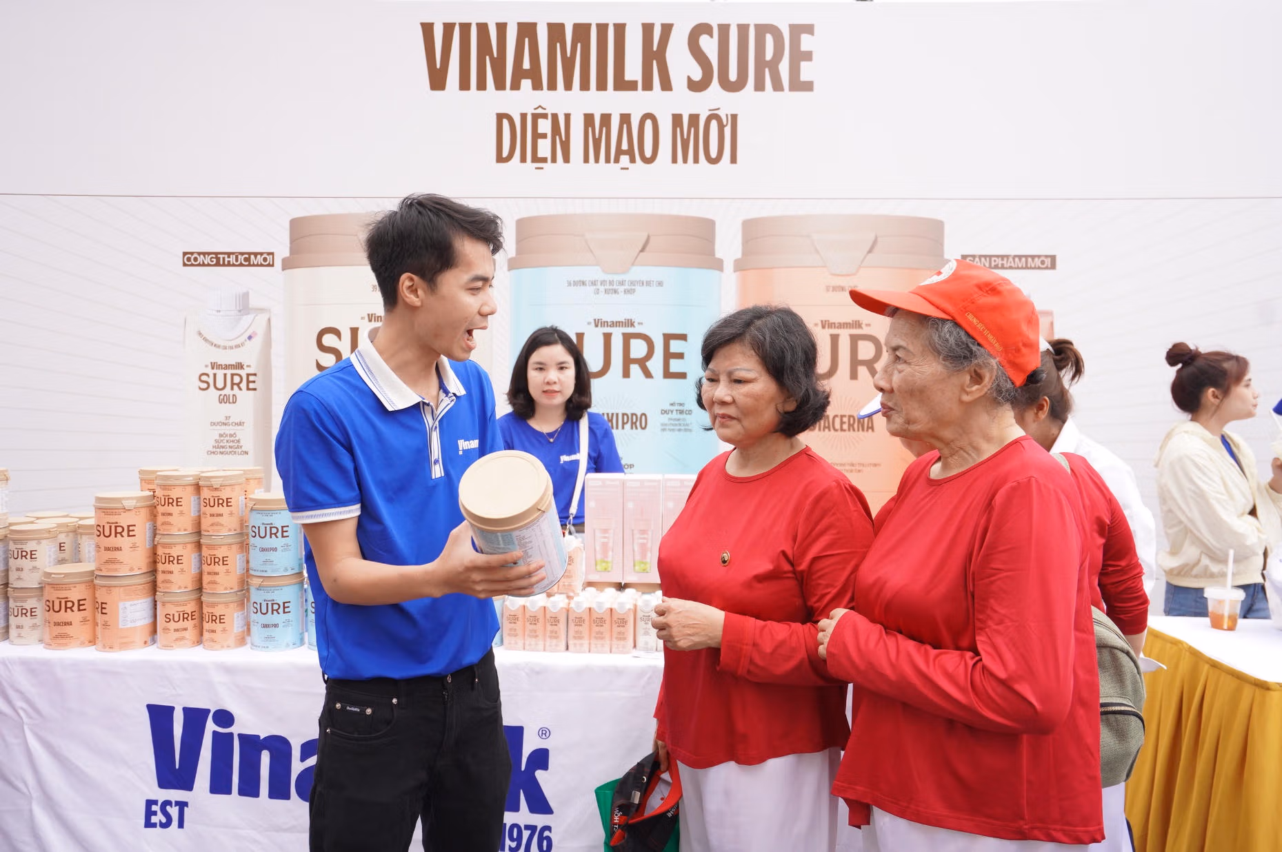 Trong không khí sôi động của ngày hội, khu vực tư vấn dinh dưỡng của Vinamilk Sure thu hút đông đảo người cao tuổi dừng chân. Tại đây, các chuyên gia đến từ Vinamilk chia sẻ về chăm sóc sức khỏe chủ động ở tuổi trung niên và cao tuổi, đồng thời tiếp sức cho người tham gia qua các sản phẩm dinh dưỡng phù hợp như sữa đậu nành, sữa tươi, sữa chua ăn.