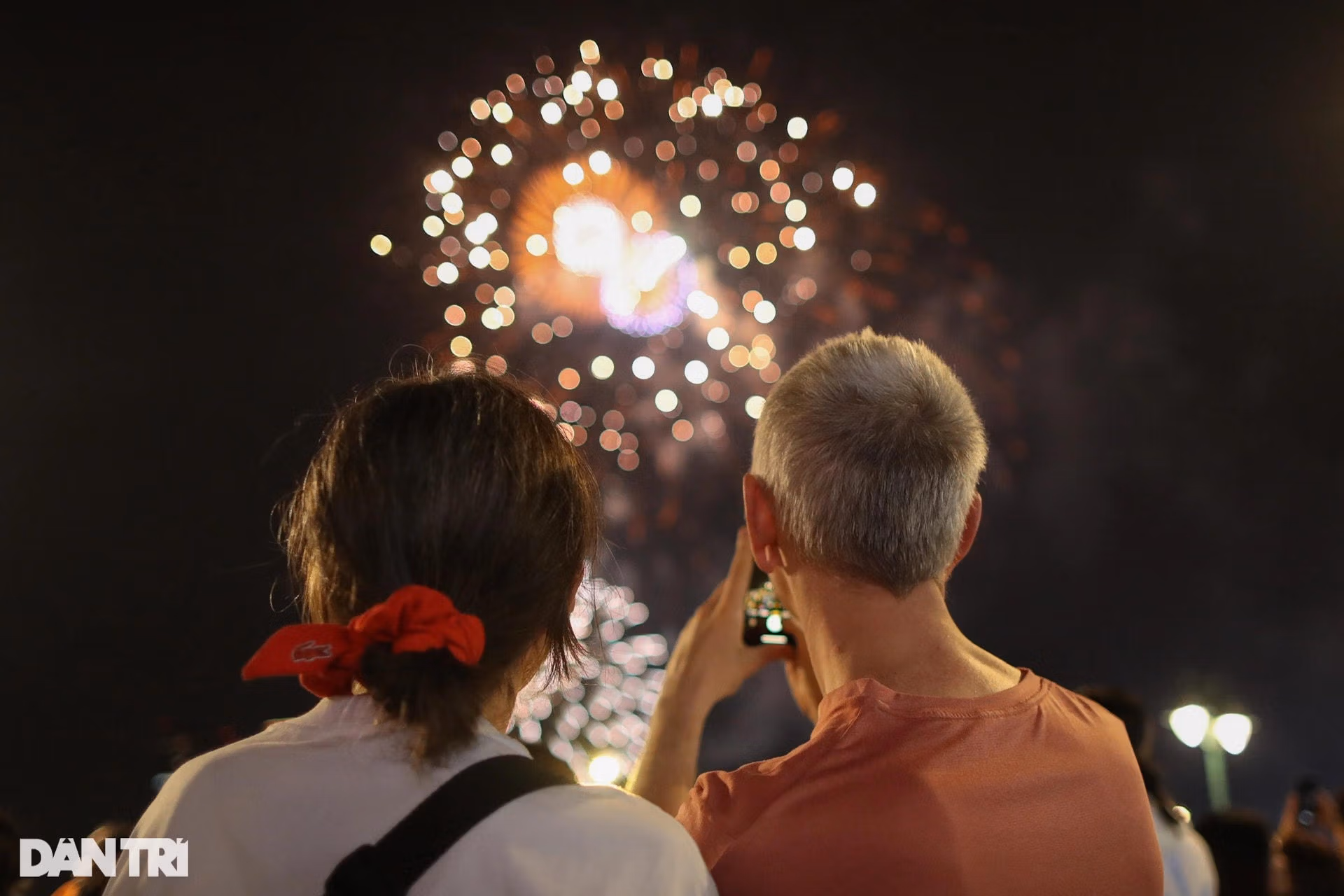 Một số người dân tìm được "view đẹp" trên cao để ngồi chiêm ngưỡng pháo hoa từ công viên bến Bạch Đằng (Ảnh: Hải Long).
