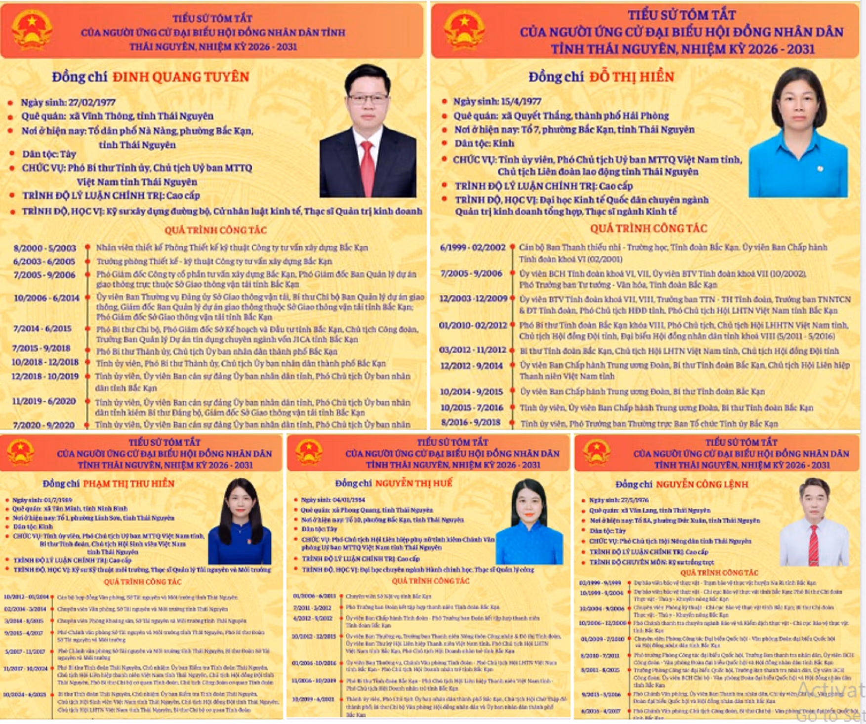 Ủy ban MTTQ Việt Nam tỉnh Thái Nguyên cho biết, có 5 cán bộ Mặt trận Tổ quốc tham gia ứng cử đại biểu HĐND tỉnh nhiệm kỳ 2026 - 2031. Trong đó có Chủ tịch, hai Phó Chủ tịch (kiêm lãnh đạo các tổ chức chính trị - xã hội) và hai Phó Chủ tịch các hội đoàn thể, tham gia ứng cử tại nhiều đơn vị bầu cử khác nhau trên địa bàn tỉnh.