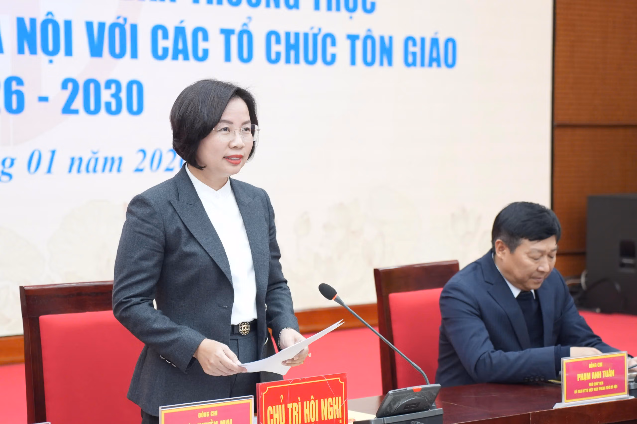 Ủy viên Ban Thường vụ Thành ủy, Chủ tịch Ủy ban MTTQ Việt TP Hà Nội Bùi Huyền Mai và các đồng chí trong Ban Thường trực chủ trì hội nghị. Tham dự Hội nghị có ông Nguyễn Văn Thanh, Ủy viên Đoàn Chủ tịch UBTƯ MTTQ Việt Nam, Trưởng ban Dân tộc và Tôn giáo.