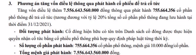 MBB sẽ tăng vốn điều lện thêm hơn 7.557 tỷ đồng thông qua việc phát hành hơn 755 triệu cổ phần phổ thông để trả cổ tức (tương đương với tỷ lệ 20% tổng số cổ phần phổ thông đang lưu hành tại thời điểm 31/12/2021).