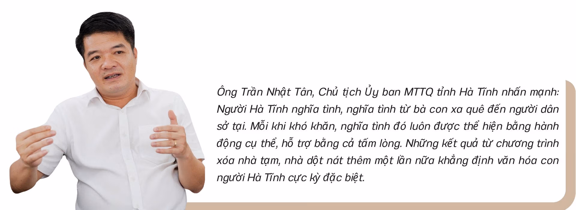 Hà Tĩnh đã về đích trước gần 6 tháng so với mốc 31/10/2025 mà Chính phủ đặt ra. Toàn tỉnh đã huy động kinh phí hơn 246 tỷ đồng thực hiện chương trình xóa nhà tạm, nhà dột nát. Tỉnh Hà Tĩnh còn sáng tạo, linh hoạt trong triển khai các mô hình phân công “đỡ đầu”, thành lập các “đội xây dựng không đồng”, “hỗ trợ theo địa bàn”, “phân công mỗi cán bộ công chức, viên chức trực tiếp phụ trách một nhà”.