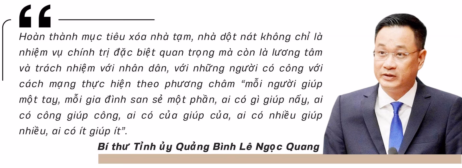Ông Lê Ngọc Quang, Bí thư Tỉnh ủy, Trưởng Ban Chỉ đạo xóa nhà tạm, nhà dột nát tỉnh Quảng Bình cho biết: Với tinh thần “6 rõ là rõ người, rõ việc, rõ trách nhiệm, rõ thẩm quyền, rõ thời gian, rõ kết quả”, Quảng Bình quyết tâm hoàn thành cả 3 chương trình xoá nhà tạm, nhà dột nát tại tỉnh Quảng Bình trước ngày 2/9 năm nay.