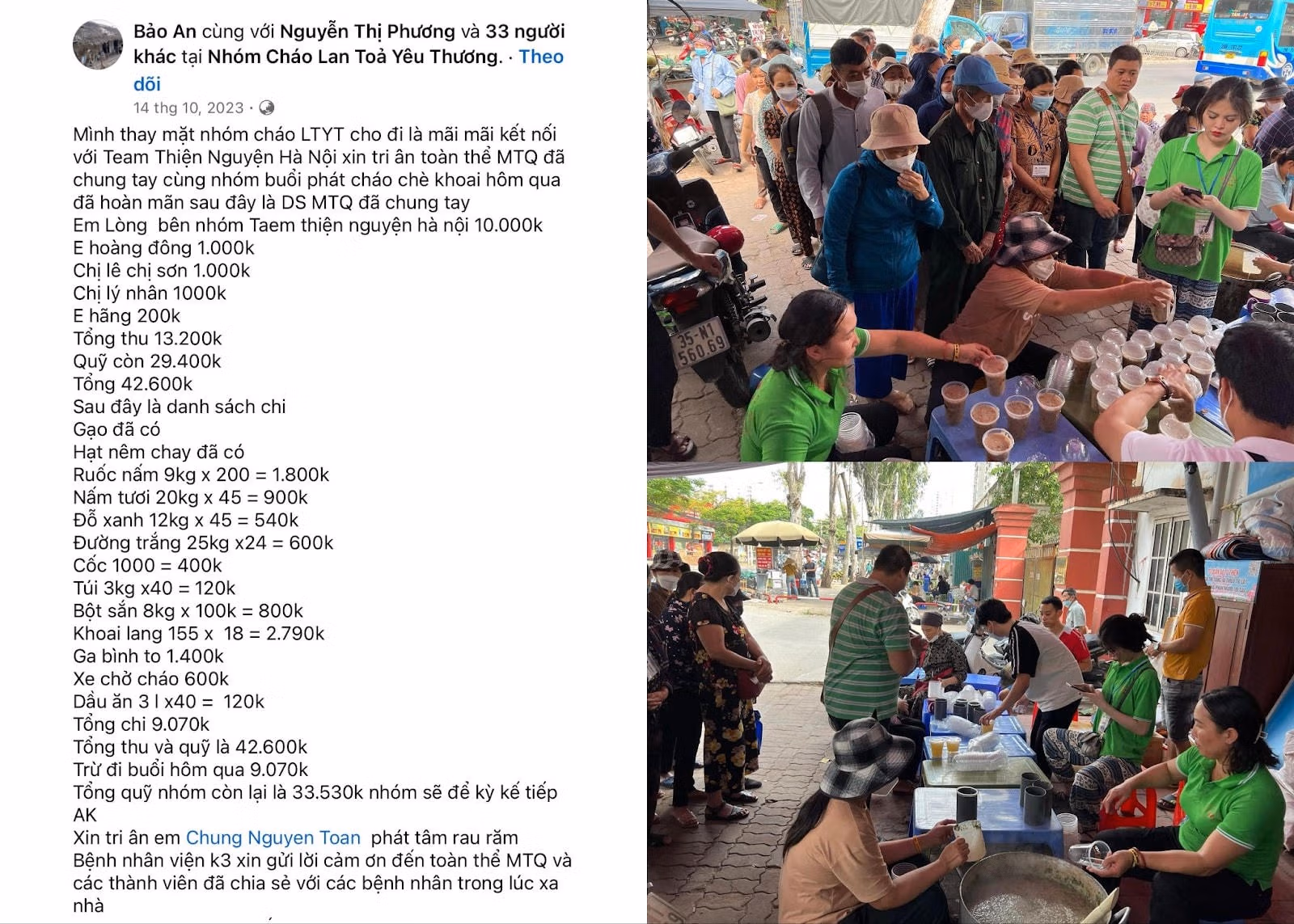Sau khi tính toán chi phí cho việc mua nguyên liệu và các khoản cần thiết để tổ chức buổi nấu cơm, nhóm đã chi tổng cộng 14.560.000 đồng, trong đó bao gồm các khoản mua giò chay, cải bắp, cà rốt, đậu phụ, sườn non chay,... và nhiều nguyên liệu khác. Phần quỹ còn lại là 15.420.000 đồng sẽ được dùng cho các hoạt động từ thiện tiếp theo, với thông tin chi tiết về mọi khoản chi phí được cập nhật công khai.