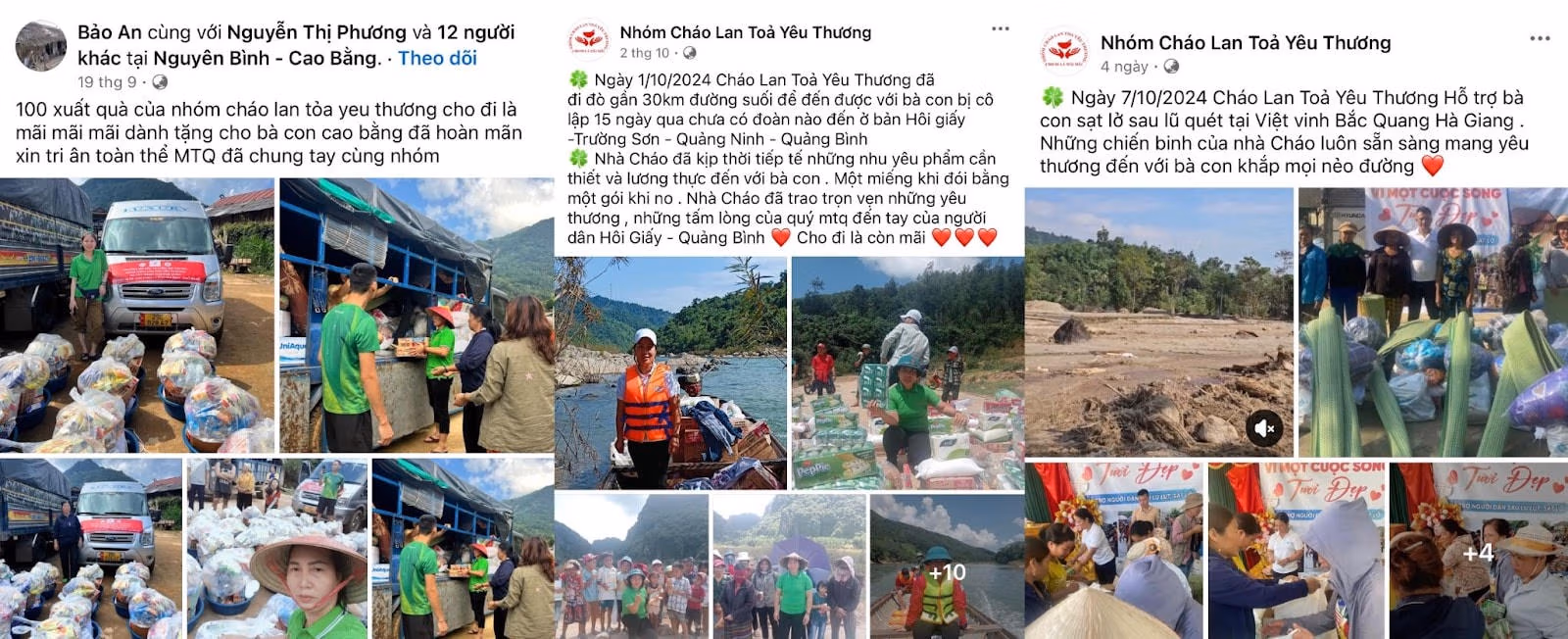 Những chuyến đi này không chỉ mang theo đồ đạc sinh hoạt, quần áo mới, mà còn cung cấp lương thực, thực phẩm để người dân sớm vượt qua giai đoạn khó khăn. Trong suốt quá trình hoạt động, Nhóm Cháo Lan Tỏa Yêu Thương đã giúp đỡ rất nhiều hoàn cảnh với tinh thần sẻ chia và trách nhiệm cộng đồng, góp phần tạo dựng niềm tin và kết nối tình người trong xã hội.