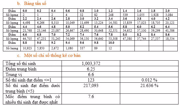 Số thí sinh có điểm <= 1 là 123 (chiếm tỷ lệ 0.012%); số thí sinh đạt điểm dưới trung bình là 217,093 (chiếm tỷ lệ 21.64%).