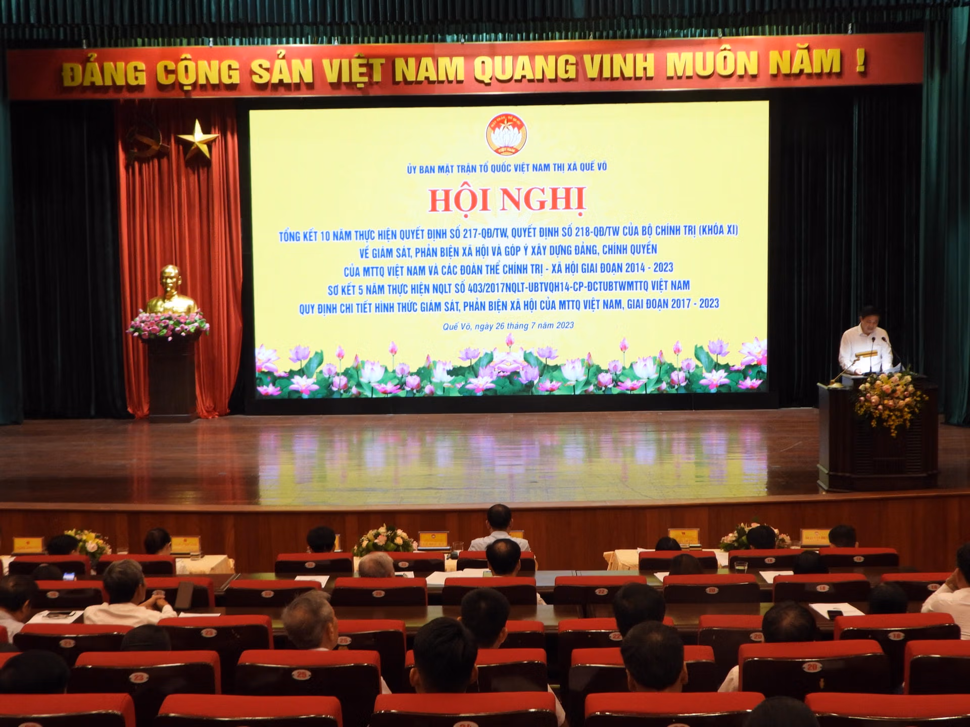 Ngày 26/7, Ủy ban MTTQ Thị xã Quế Võ tổ chức Hội nghị Tổng kết 10 năm thực hiện Quyết định số 217-QĐ/TW, Quyết định số 218-QĐ/TW của Bộ Chính trị (khóa XI) về giám sát, phản biện xã hội và góp ý xây dựng Đảng, chính quyền của MTTQ Việt Nam và các đoàn thể chính trị - xã hội giai đoạn 2014 - 2023.