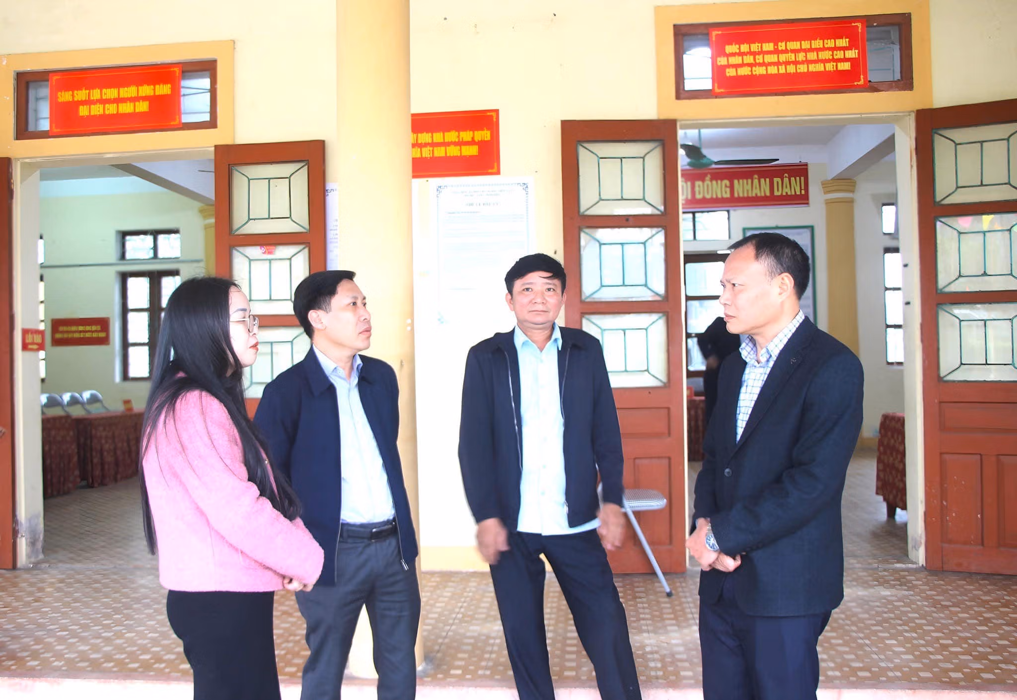 Đoàn đã trực tiếp kiểm tra việc chuẩn bị cơ sở vật chất, trang trí khánh tiết, hòm phiếu, niêm yết danh sách cử tri, danh sách ứng cử viên và các điều kiện cần thiết phục vụ ngày bầu cử.