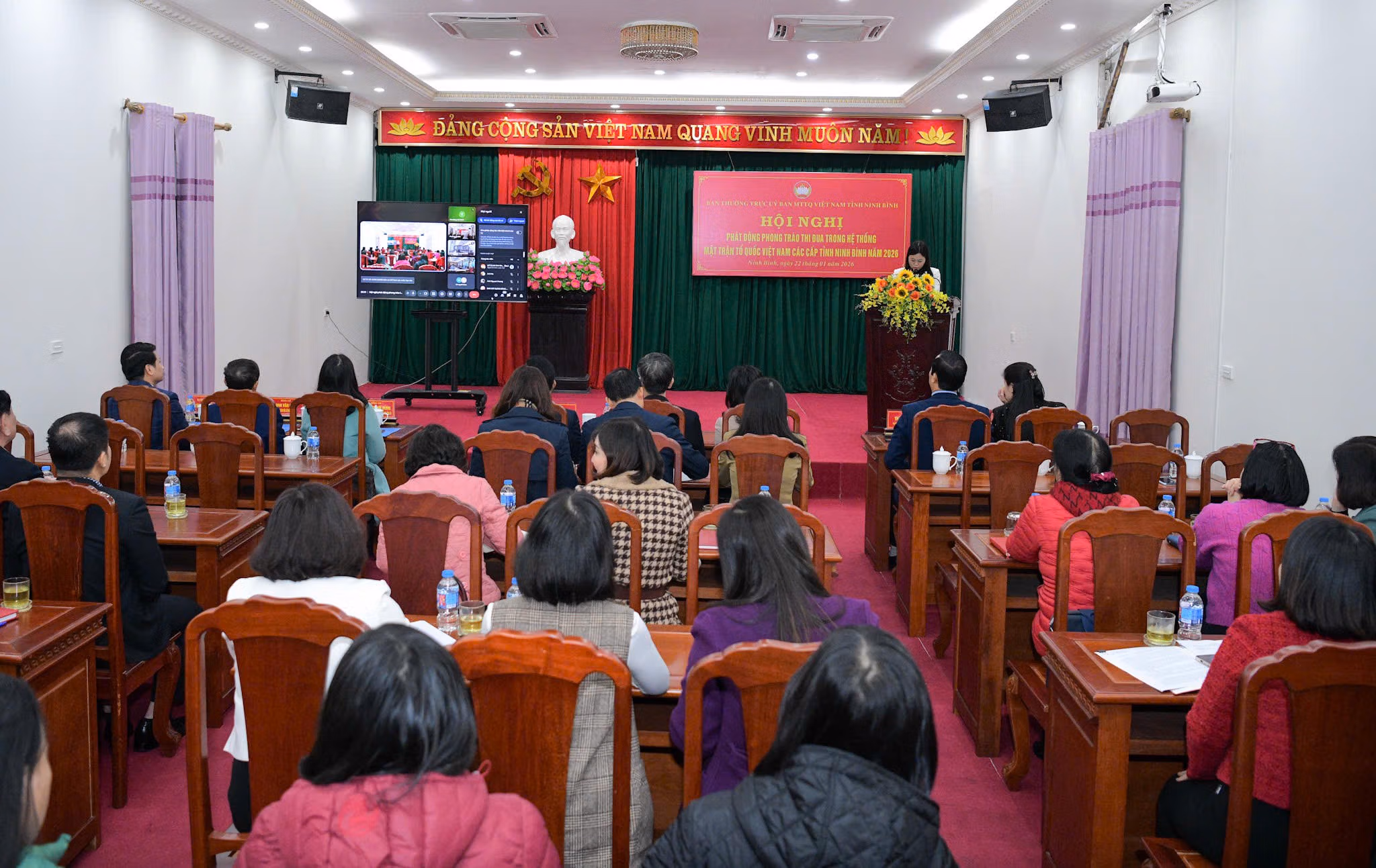 Ngày 22/1, tại phường Hoa Lư, Ủy ban MTTQ tỉnh Ninh Bình tổ chức hội nghị phát động phong trào thi đua yêu nước trong hệ thống MTTQ các cấp năm 2026. Hội nghị được kết nối trực tuyến tới 129 điểm cầu xã, phường trên địa bàn tỉnh, với sự tham dự của Ban Thường trực Ủy ban MTTQ tỉnh; lãnh đạo các tổ chức thành viên; lãnh đạo, chuyên viên các ban, văn phòng cơ quan MTTQ tỉnh; Chủ tịch, Phó Chủ tịch, Ủy viên Ủy ban MTTQ các xã, phường.