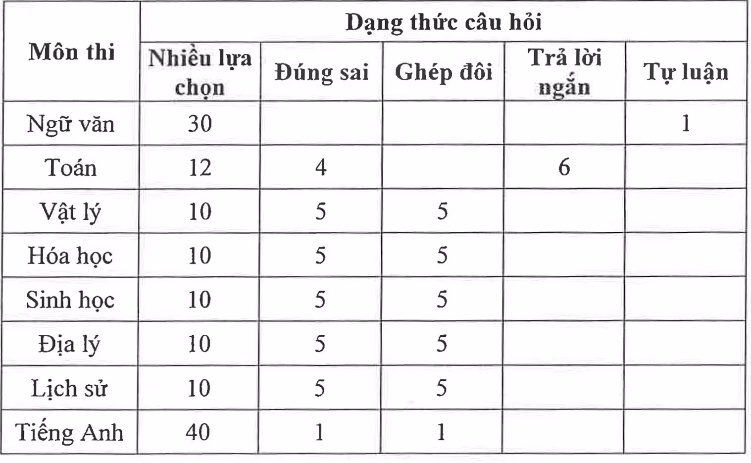 Theo đó, nhà trường tổ chức 8 môn thi, gồm: Ngữ văn, Toán, Tiếng Anh, Lịch sử, Vật lý, Hoá học, Sinh học, Địa lý. Trong số này, môn Ngữ văn thi theo hình thức trắc nghiệm kết hợp tự luận. Các môn còn lại thi theo hình thức trắc nghiệm.