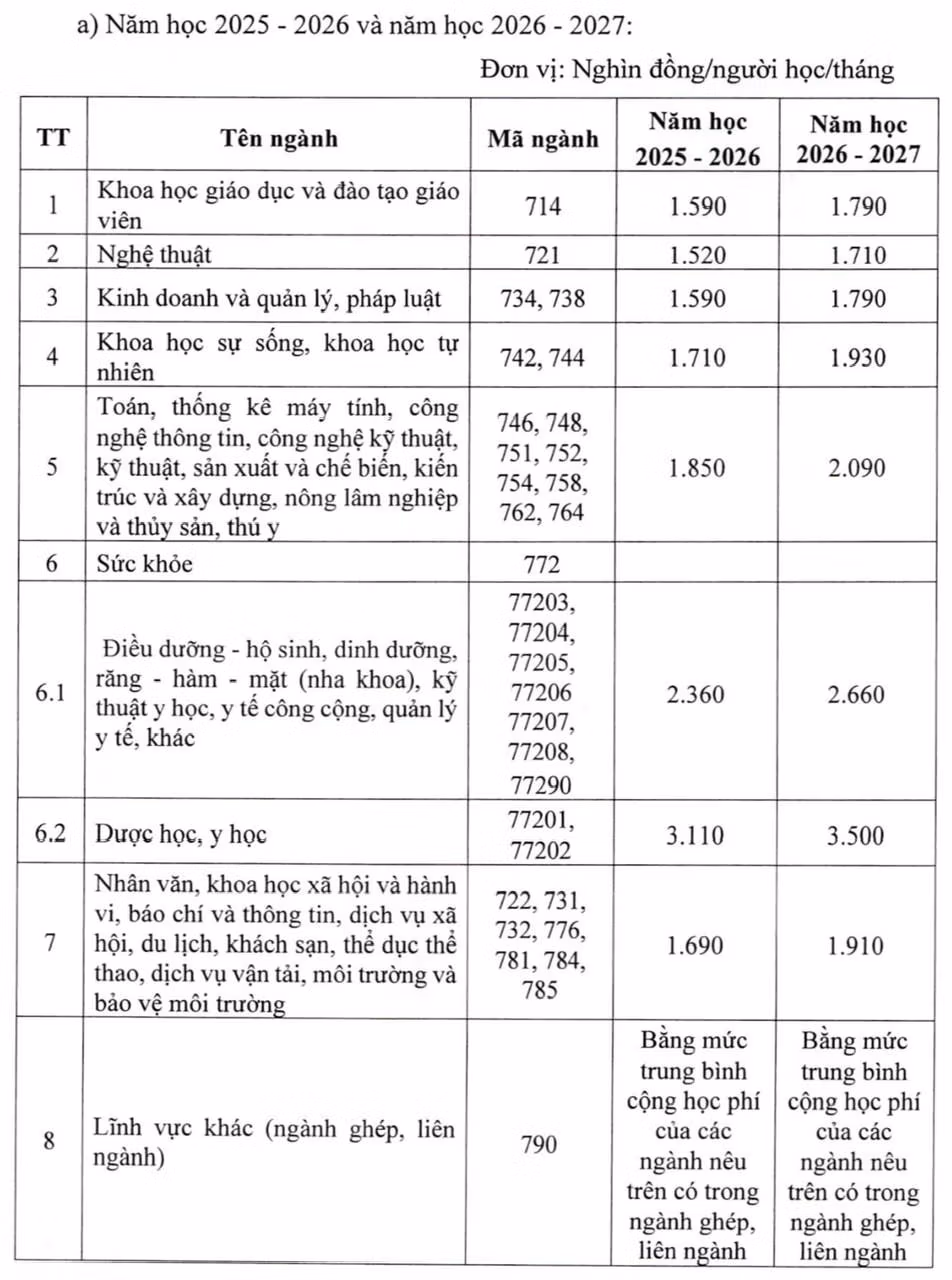 Nhiều trường đại học cũng đã công bố mức học phí mới như: Trường Đại học Dược Hà Nội từ 17,1 – 27,6 triệu đồng (hệ đại trà)... tăng từ 2 đến 5 triệu đồng so với năm học trước; Trường Đại học Y Dược Thái Bình năm học 2025-2026 từ 42 đến 55,5 triệu đồng, tăng 10,8-14,3 triệu đồng so với năm học 2024-2025.