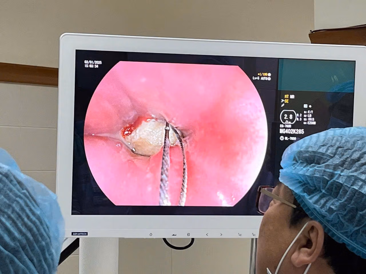 Ngay lập tức, bệnh nhân được chuyển đến phòng mổ để tiến hành nội soi thực quản ống cứng lấy dị vật dưới gây mê. Quá trình phẫu thuật kéo dài hơn một giờ đồng hồ, với sự phối hợp của đội ngũ nhân viên y tế của các chuyên khoa thực hiện, đã lấy bỏ dị vật mà không làm tổn hại thêm đến thực quản.
