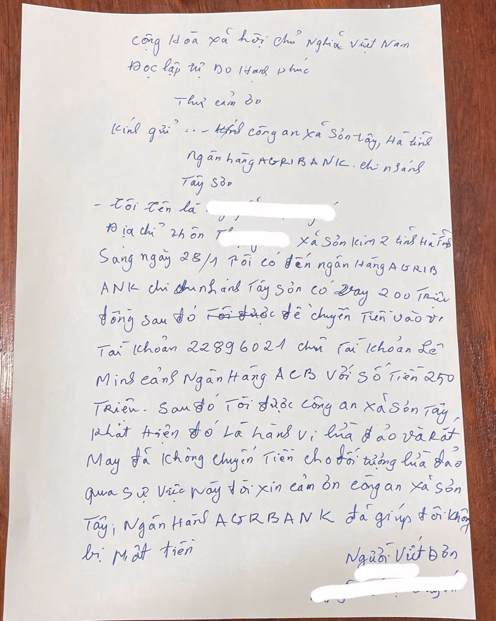 Tin theo lời dụ dỗ, bà N.T.T. (SN 1968, trú xã Sơn Kim 2, tỉnh Hà Tĩnh) đã vay 200 triệu đồng tại ngân hàng và chuẩn bị thêm 50 triệu đồng tiền mặt để chuyển cho các đối tượng.