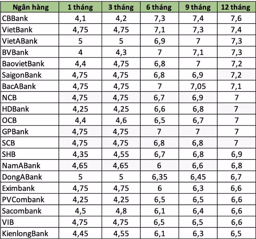 CBBank hiện trả lãi suất 7,6%/năm, đây là đơn vị trả lãi suất cao nhất tính đến đầu tháng 8. Theo sau là VietBank với 7,4%/năm, VietABank và BVBank cùng ở mức 7,3%/năm. Ngoài ra, một số ngân hàng như SaigonBank, BacABank, OCB, HDBank… cũng áp dụng mức lãi suất trên 7%/năm.