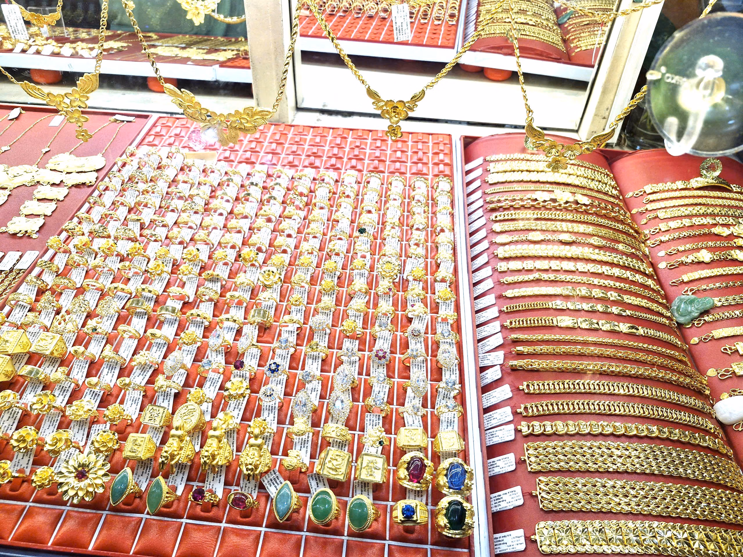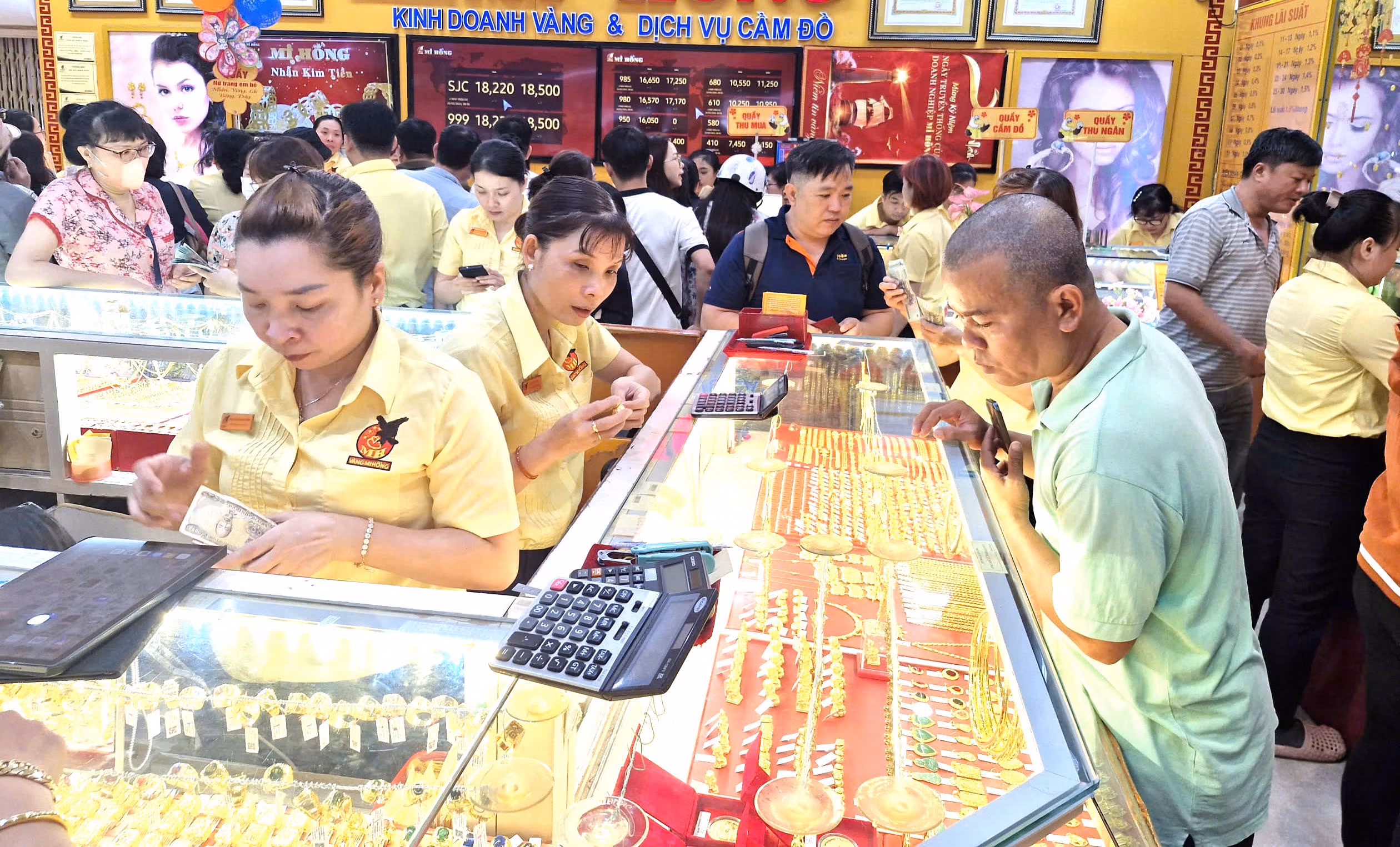 Tại tiệm vàng Mi Hồng (khu vực chợ Bà Chiểu), người dân bốc số chờ giao dịch. Ba khu vực kinh doanh vàng nữ trang, vàng miếng và vàng nhẫn đều kín khách. Riêng quầy vàng nhẫn, mỗi lượt có khoảng 6–10 người được hướng dẫn vào giao dịch và mỗi khách được giới hạn tối đa 1 chỉ để đảm bảo nhiều người có thể mua lấy may.