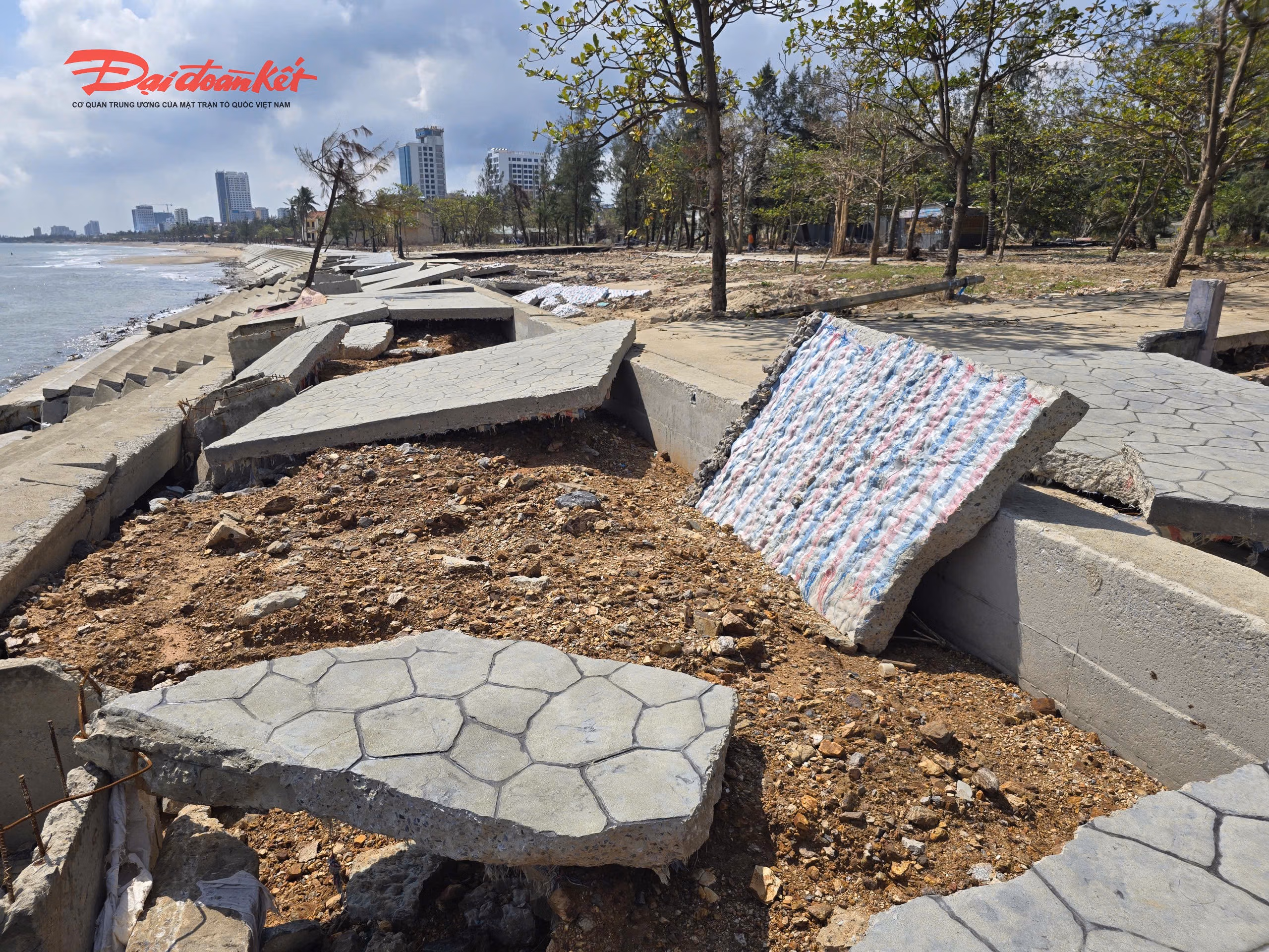 Lớp bê tông trên mặt kè vốn là lối đi dạo ven biển bị nứt vỡ thành từng mảng lớn, có tấm bị sóng đánh sụt xuống biển, số khác bị đẩy dạt lên bờ cát. Hệ thống bậc lên xuống và cống thoát nước bị xô lệch, hư hỏng nặng. Người dân địa phương cho biết, mỗi khi triều cường dâng, sóng lớn tiếp tục đánh sâu vào nền móng kè, tiềm ẩn nguy cơ sạt lở lan rộng nếu không được khắc phục sớm.