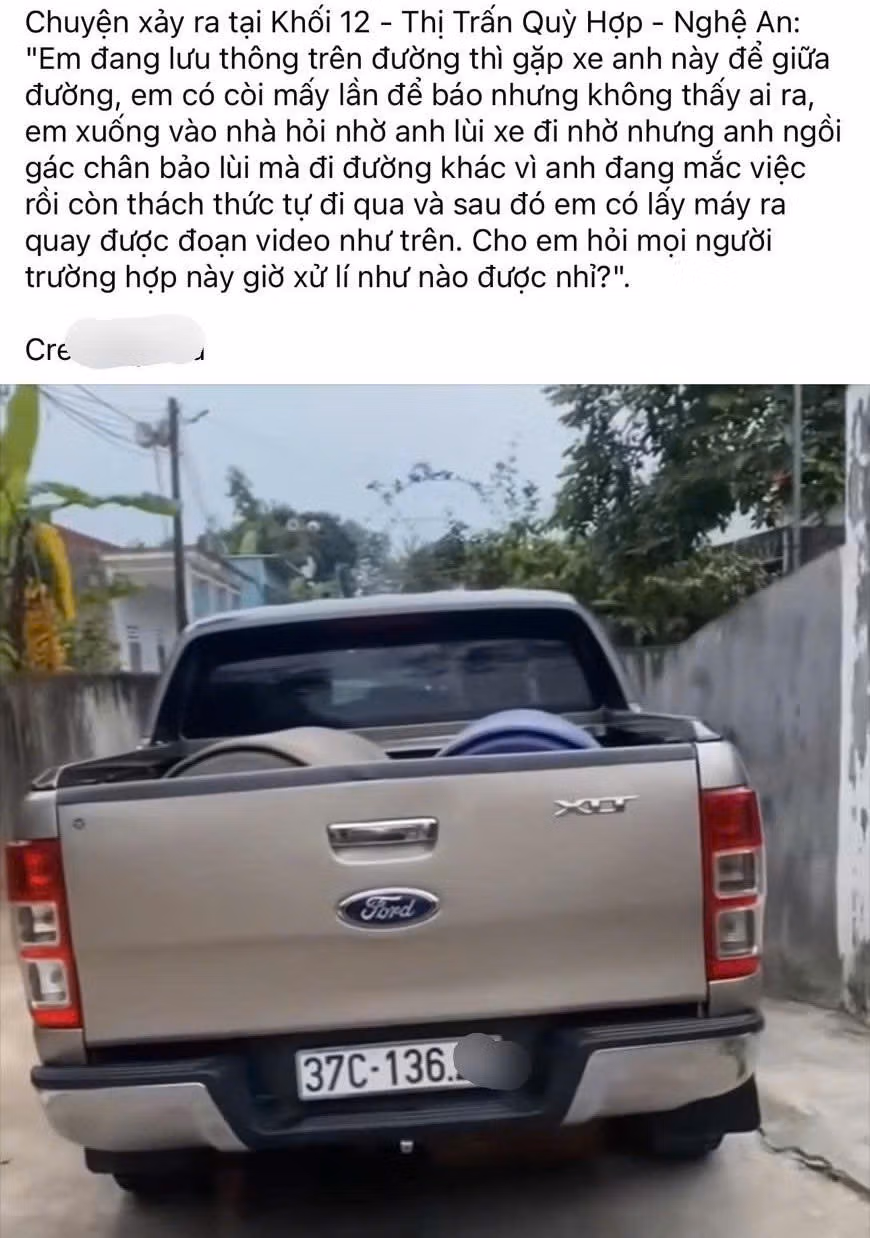 Mới đây, mạng xã hội lan truyền clip ghi lại cảnh một ô tô bán tải đỗ chắn ngang lối đi tại xã Quỳ Hợp, tỉnh Nghệ An. Khi được nhắc nhở, tài xế không hợp tác, còn thách thức người dân.