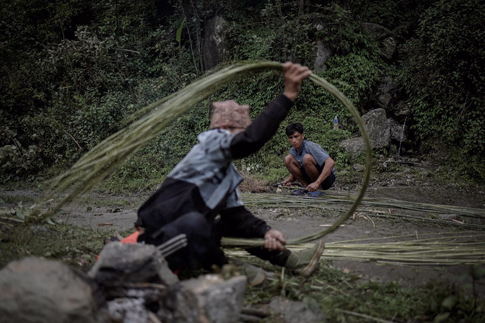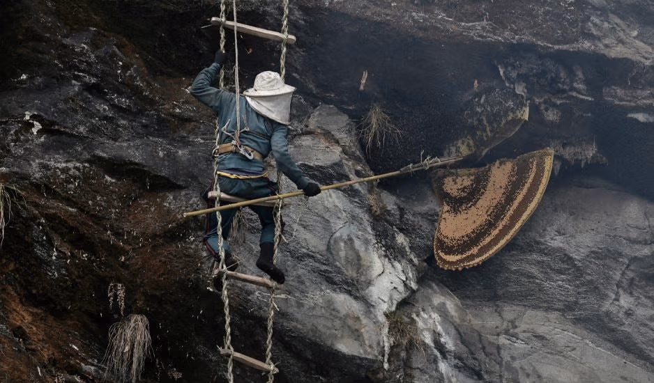 Aita Prasad Gurung treo mình trên một vách đá ở Nepal, cẩn thận điều khiển một cây sào dài có lưỡi dao ở ngọn để cắt những khối tổ ong khổng lồ sau khi những con ong Himalaya chạy trốn khói được đốt bởi người thu hoạch mật ong để đuổi chúng ra khỏi tổ.