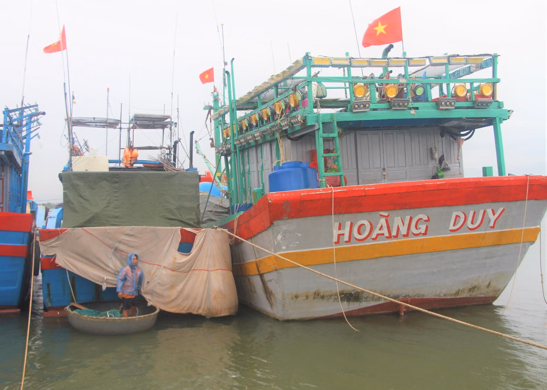Sáng 24/8, tại âu thuyền An Hòa, xã Núi Thành, TP Đà Nẵng có rất nhiều tàu thuyền của ngư dân đã vào khu neo đậu an toàn. Ngư dân đang khẩn trương dùng dây thừng cột chằng buộc tàu cá, nhằm tránh va chạm với tàu khác khi gió mạnh, sóng lớn trong lúc bão số 5 đổ bộ vào đất liền.