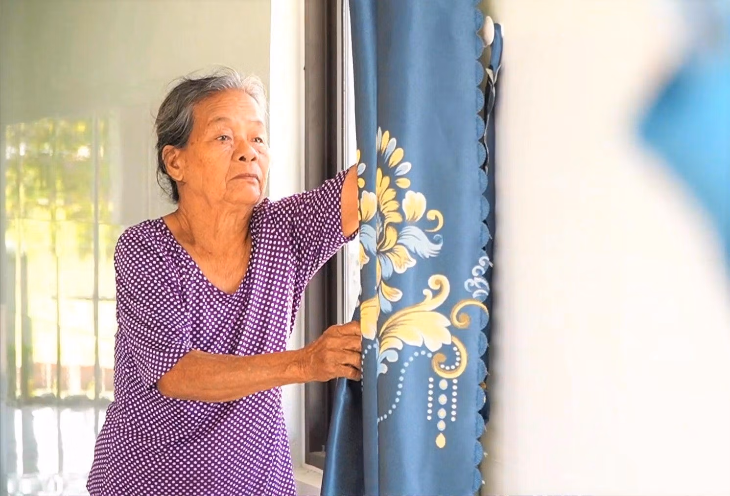 Tại xã Đề Gi, tỉnh Gia Lai, bà Nguyễn Thị Vàng (55 tuổi), khi chúng tôi đến, thấy bà đang tất bật quét dọn, treo cờ Tổ quốc và trang trí nhà cửa để đón năm mới 2026 trong căn nhà thuộc chiến dịch “Quang Trung”.