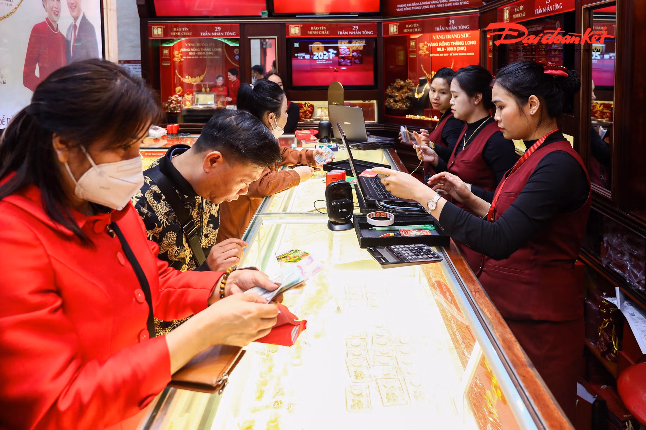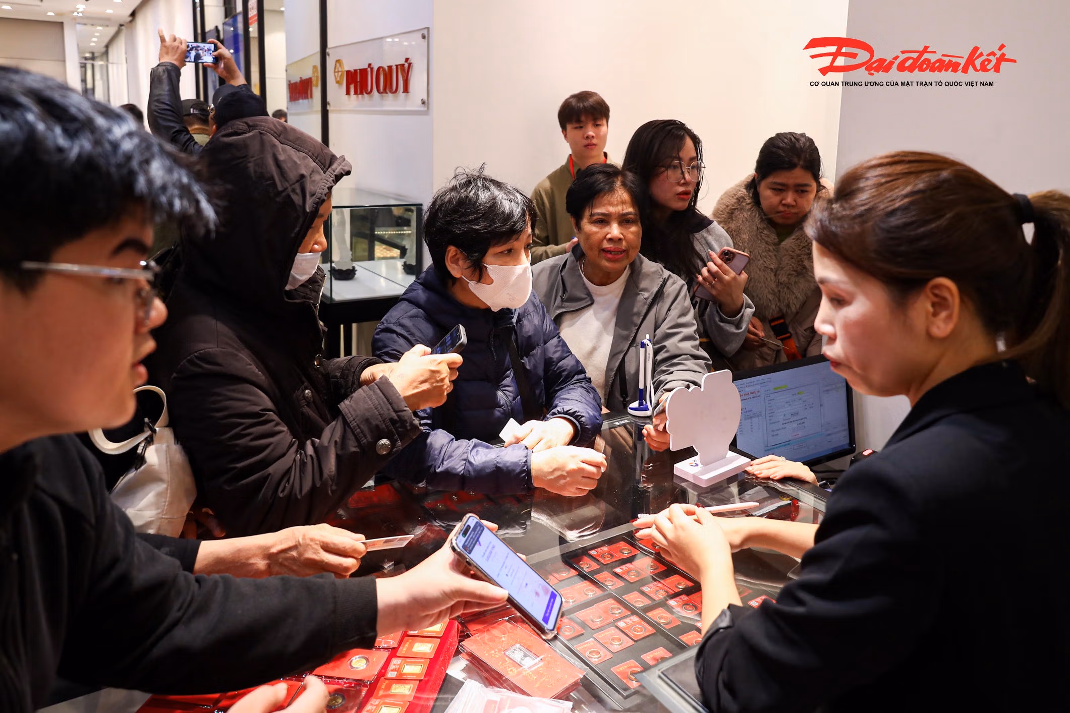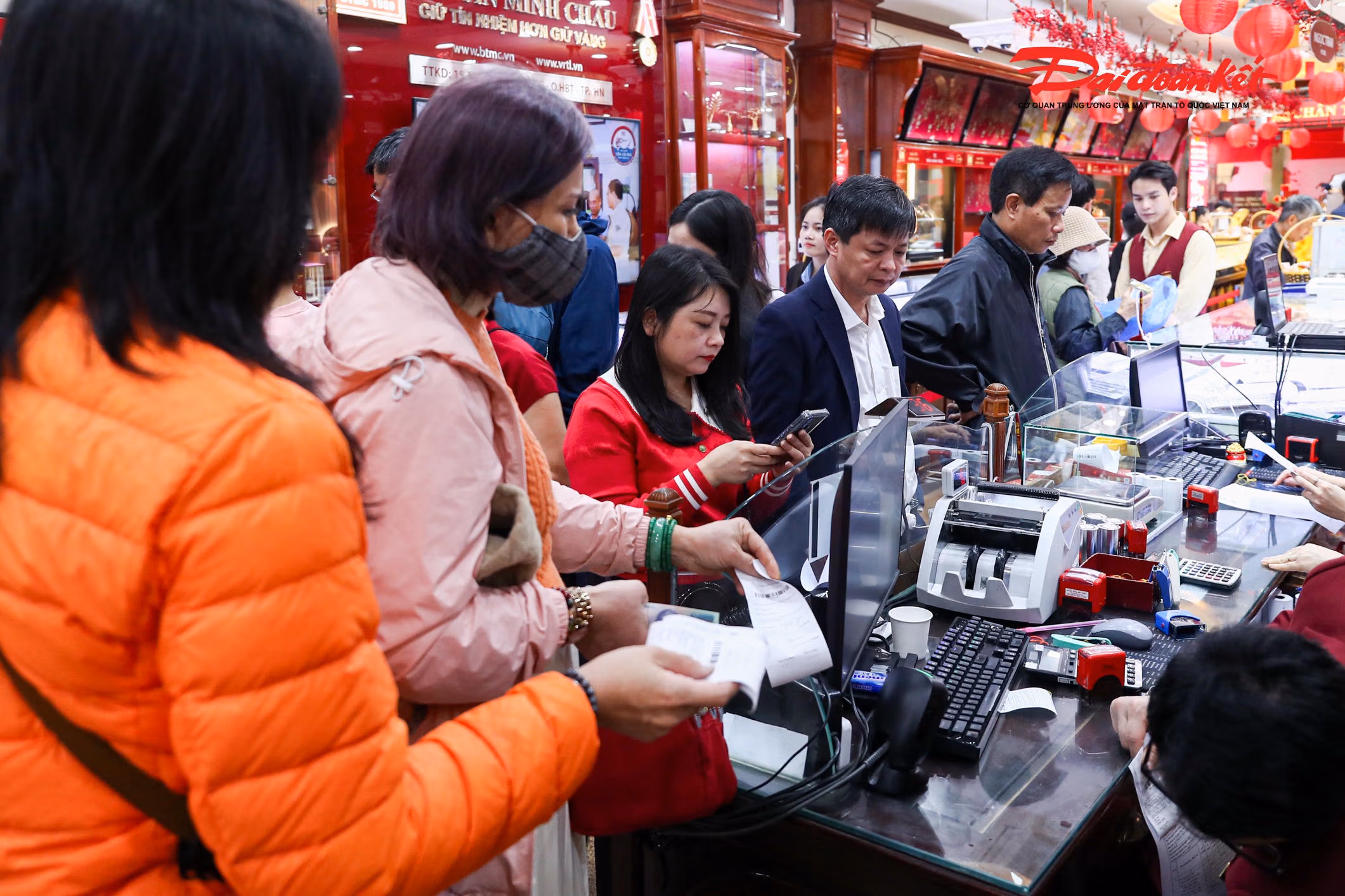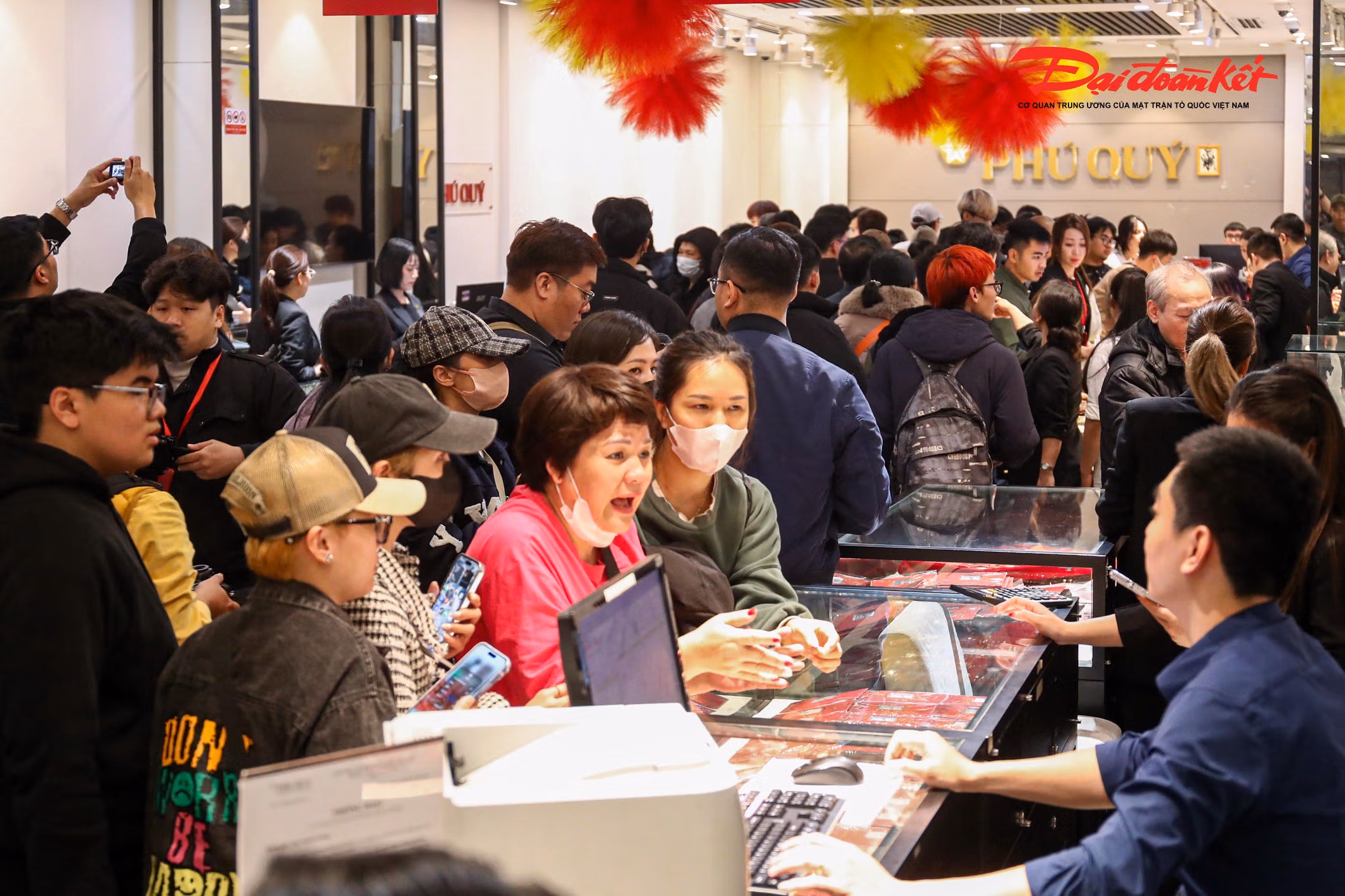 Khoảng 6h–6h30 sáng, các cửa hàng đồng loạt mở cửa, dòng khách xếp hàng từ sớm nhanh chóng di chuyển vào bên trong để thực hiện giao dịch mua vàng.