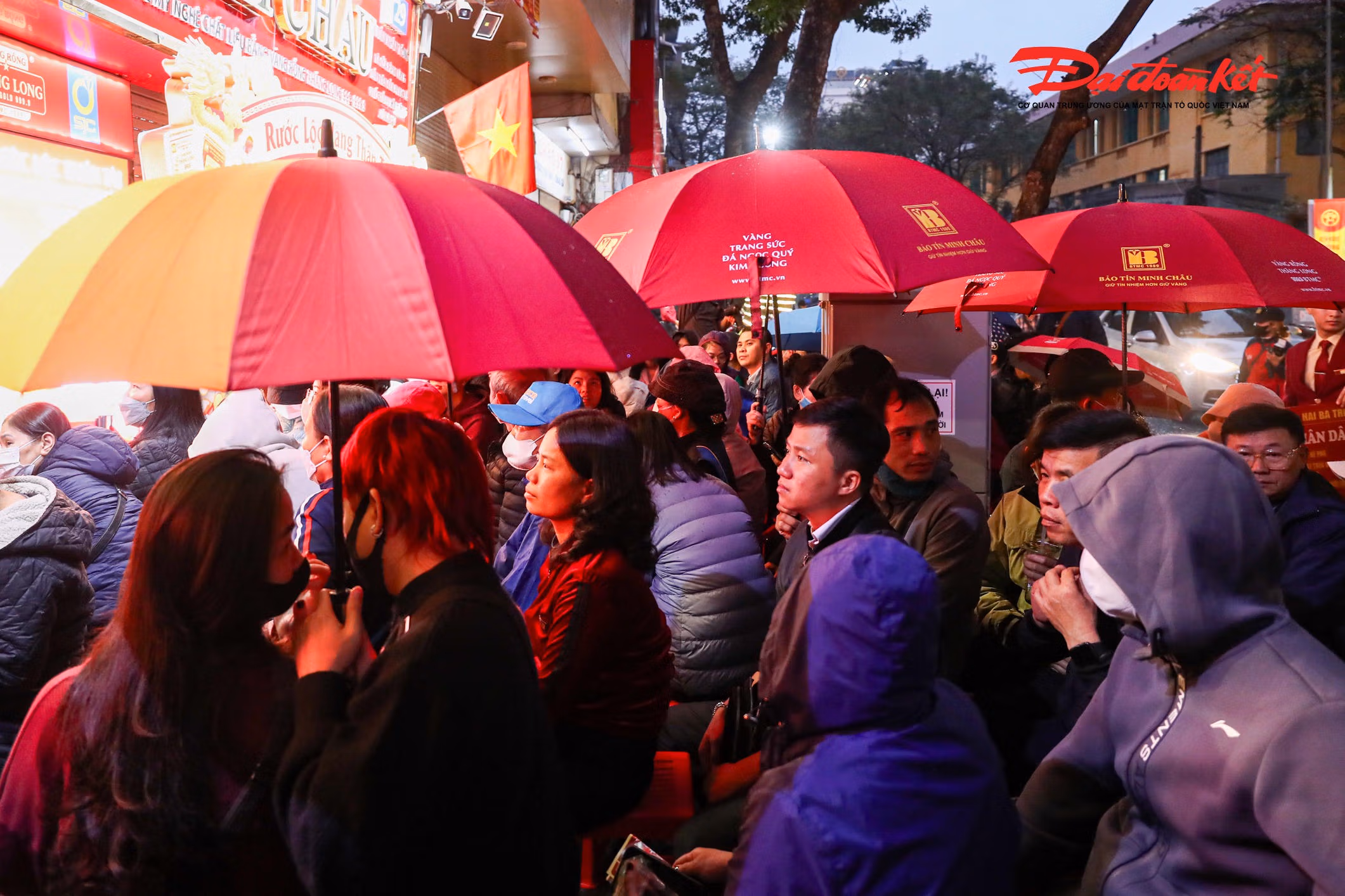 Khoảng 5h30 sáng, khu vực chờ trước cửa hàng vàng Bảo Tín Minh Châu đã chật kín người, bất chấp thời tiết giá lạnh và mưa phùn lất phất.