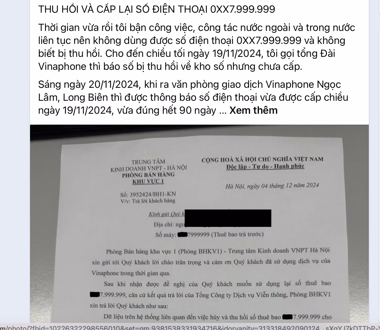 Cụ thể, theo chủ thuê bao SIM số đẹp đăng tải trên Facebook N.Đ.Q chia sẻ, thời gian qua do bận công việc công tác nước ngoài và trong nước liên tục nên không dùng được số điện thoại 0XX7.999.999 và không biết bị thu hồi.