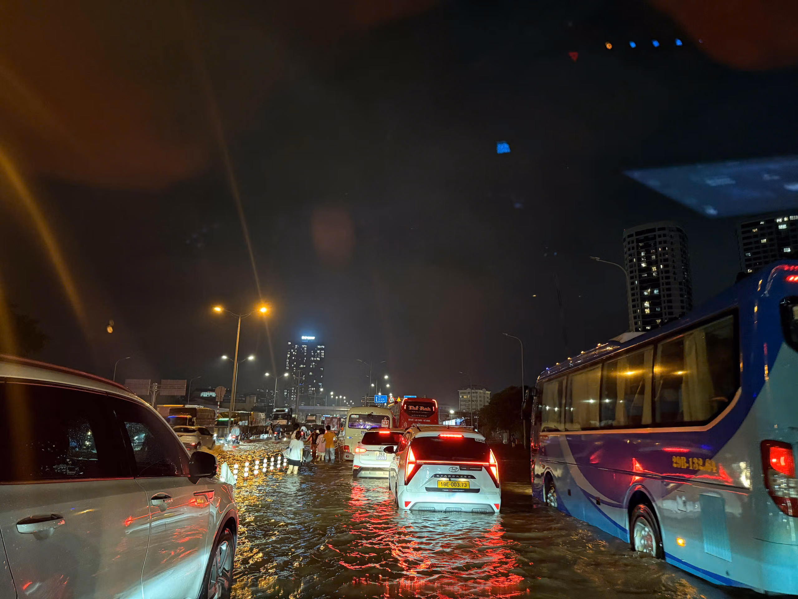 Người Hà Nội vẫn lội nước 'bì bõm' về nhà trong đêm Thứ Tư 01/10/2025 00:01 (GMT+7) Dù đã 22h đêm ngày 30/9, nhưng nhiều người dân Hà Nội vẫn chưa thể về nhà vì ngập úng. Theo ghi nhận của PV Báo Đại đoàn kết khoảng 22h15, khu vực cầu Vĩnh Tuy đoạn nút giao Cổ Linh tiếp tục có mưa lớn. Các hướng đi đều bị ngập sâu từ 40-50cm. Nhiều phương tiện không thể di chuyển, chết máy.Xe chết máy, nhiều người vất vả dắt xe lội bì bõm qua vũng nước dài hàng trăm mét.Mỗi khi ô tô di chuyển qua, từng con sóng táp vào khiến các phương tiện đi xe máy mất cân bằng.Nhiều người sốt ruột vì đứng 'chôn chân' nhiều giờ đồng hồ.Dù đã đêm muộn, nhưng việc di chuyển của người dân vẫn gặp rất nhiều khó khăn.Lực lượng CSGT ứng trực ngoài đường phân luồng giao thông.Cảnh sát giao thông được huy động ứng trực liên tục. Nhiệm vụ hướng dẫn xe đi vào vùng an toàn và khuyến cáo các lái xe không đủ điều kiện không nên vượt qua khu vực ngập úng.Hàng chục xe bị chết máy.Tuyến đường Vành đai 3 ùn tắc dài hàng km.Tương tự, tại tuyến đường Phạm Hùng hướng về Phạm Văn Đồng cũng xảy ra ùn tắc kéo dài khiến nhiều người dân đi bộ dưới lòng đường.Dòng xe 'ken đặc' di chuyển về nhà.Nhiều xe ô tô chết máy được xe cẩu đến đón lúc hơn 22h đêm.Giao thông Hà Nội vẫn kẹt cứng vì ngập úng.Từng dòng xe nối đuôi nhau quay trở về nhà. Lê Khánh