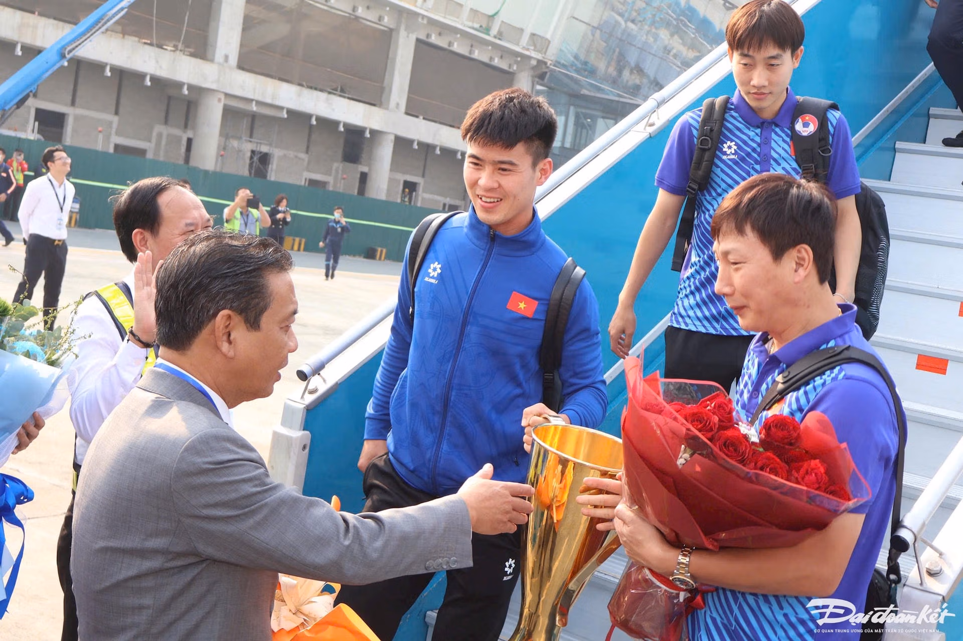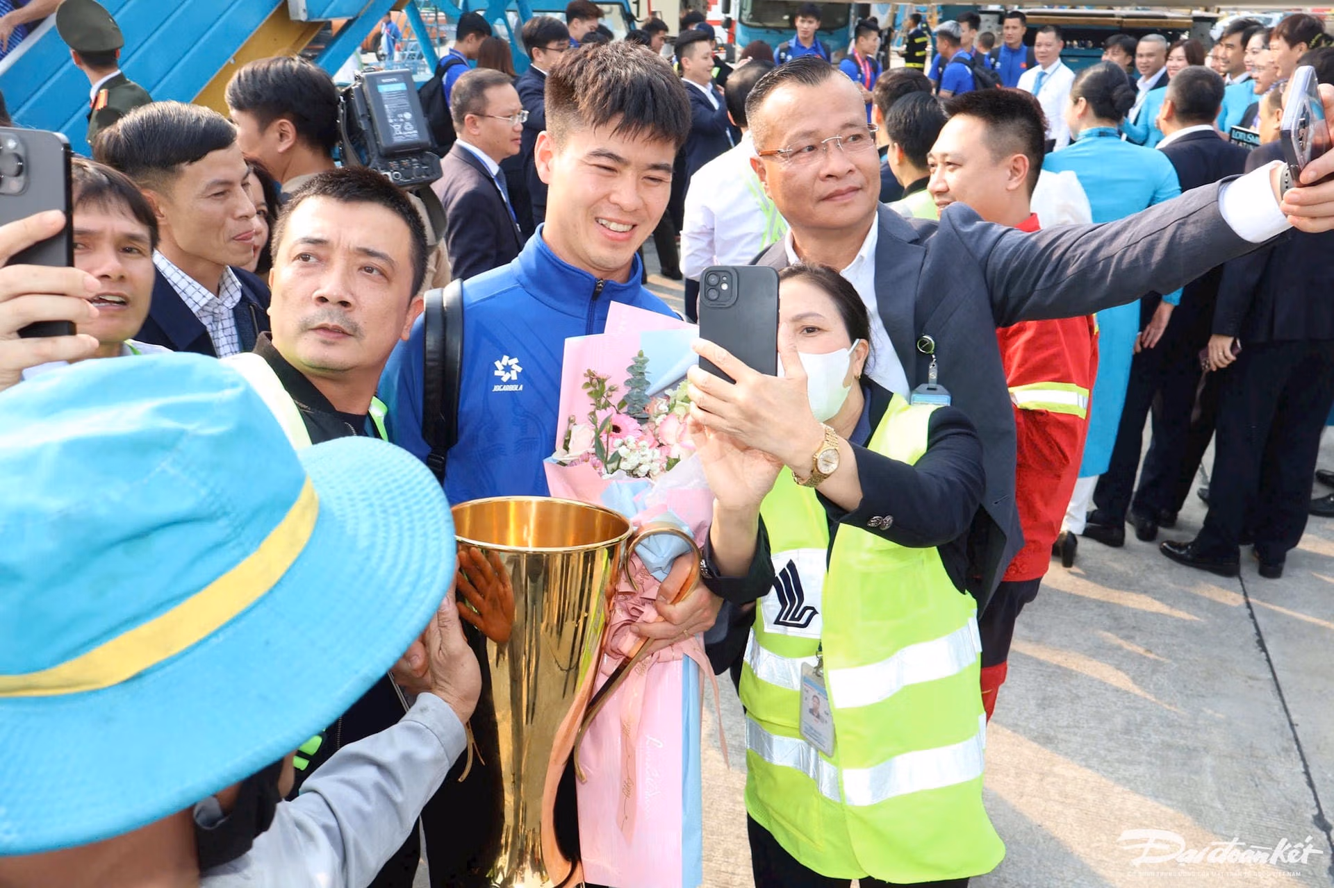 Người hâm mộ đón đội tuyển rước cúp trở về Thứ Hai 06/01/2025 16:44 (GMT+7) Ngay từ đầu giờ chiều ngày 6/1, nhiều người dân đã ra sân bay Nội Bài chào đón các cầu thủ của đội tuyển Việt Nam và chiếc cúp vô địch ASEAN Cup 2024 trở về. Video người hâm mộ chào đón các cầu thủ của đội tuyển Việt Nam và chiếc cúp vô địch ASEAN Cup 2024 trở về.14h35 ngày 6/1 chuyến bay của Vietnam Airlines hạ cánh xuống sân bay Nội Bài, mang theo những nhà vô địch cùng chiếc cúp ASEAN Cup 2024 trong sự chào đón nồng nhiệt của cổ động viên.HLV Kim Sang Sik cùng các cầu thủ của đội tuyển Việt Nam xuống sân bay với chiếc cúp vô địch.An ninh khu vực sân bay Nội Bài được thắt chặt, có lực lượng CSGT dẫn đoàn.Đại diện Cục Thể dục thể thao tặng hoa và hỏi thăm sức khỏe của cầu thủ Nguyễn Xuân Son.Chiếc xe cứu thương chở cầu thủ Nguyễn Xuân Son.Trong xe, Tiến Linh ngồi ghế đầu, cầm cúp vô địch.Hàng dài cổ động viên hò reo trên cầu Nhật Tân.Đoàn xe đưa đội tuyển Việt Nam rời sân bay Nội Bài đến trụ sở Văn phòng Chính phủ.Cổ động viên hò reo chúc mừng đội tuyển Việt Nam.Hàng dài phương tiện nối đuôi, hộ tống đoàn xe chở đội tuyển Việt Nam về nướcNgười hâm mộ gửi tình yêu tới các chàng trai vàng của bóng đá Việt Nam.Rất nhiều người hâm mộ tiếp tục "đi bão" cùng đội tuyển Việt Nam.Đoàn xe chở đội tuyển Việt Nam sau khi rời sân bay Nội Bài sẽ thực hiện lộ trình qua đường Võ Nguyên Giáp, cầu Nhật Tân, đường Âu Cơ, Yên Phụ. Điểm cuối cùng là trụ sở Văn phòng Chính phủ.Người hâm mộ chụp ảnh lưu niệm bên chiếc cúp vô địch và các cầu thủ. Lê Khánh