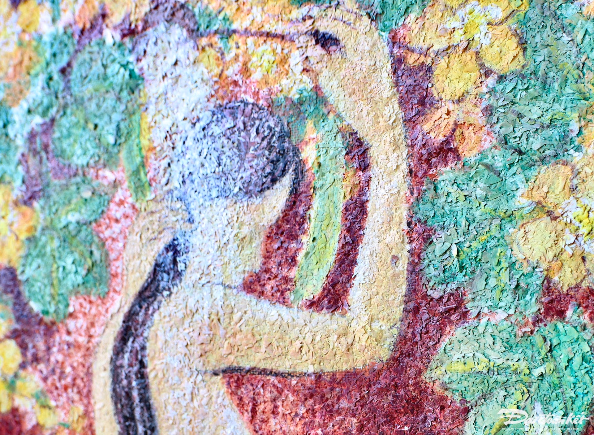 Vừa tỉ mẩn chỉnh sửa lại một số chi tiết, người họa sĩ vừa giới thiệu cho chúng tôi về bức tranh tâm đắc của mình: “Đây là bức tranh tôi lấy cảm hứng về hình tượng nàng tiên cá, ở đây tôi lồng ghép hình ảnh mây nước Hạ Long để tôn lên vẻ đẹp huyền ảo, thơ mộng. Nhìn từ xa, khi ánh sáng phản chiếu, bức tranh sẽ lấp lánh sắc màu xà cừ trắng và màu đen óng ánh của than đá”.