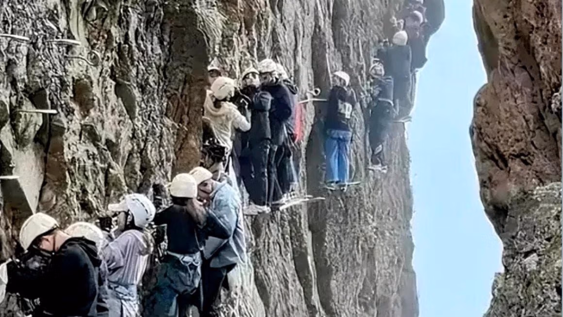 Hình ảnh những người leo núi treo mình trên vách đá trong khi chờ những người khác đi dọc theo via ferrata – những bậc kim loại được cố định trên núi – đã lan truyền trên mạng xã hội Trung Quốc.